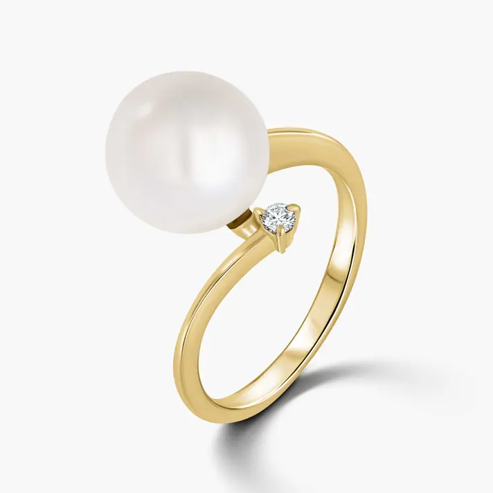 טבעת זהב 14K בשיבוץ פנינת מים מתוקים עגולה בקוטר 11 מ"מ ויהלום טבעי ונוצץ.