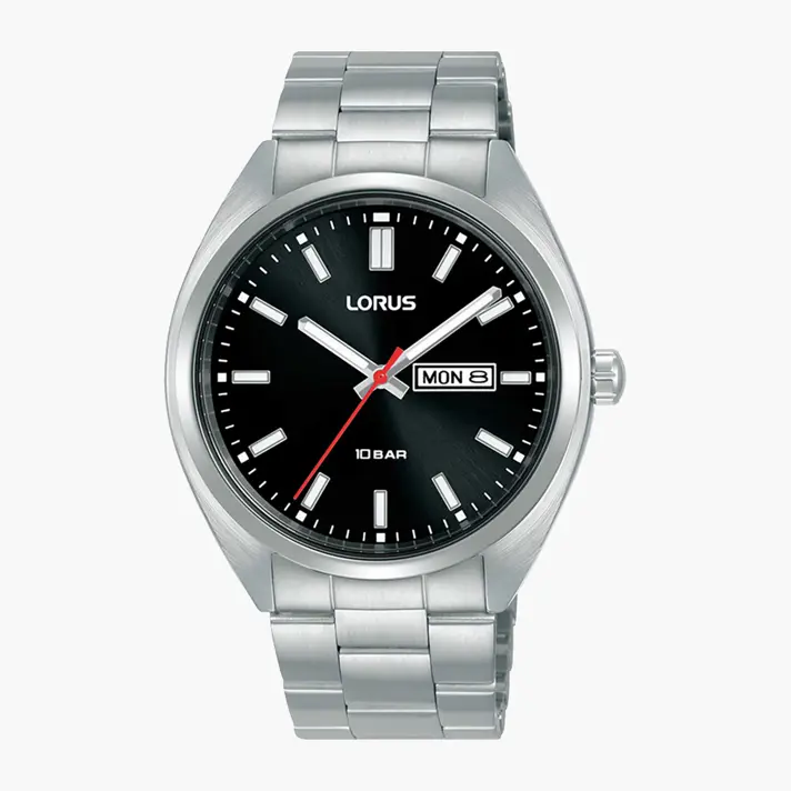 שעון LORUS אלגנטי לגברים מבית SEIKO יפן בעל מנגנון קוורץ. לוח השעון בגוון שחור בגימור מבריק. לשעון תאריכון וזכוכית מינרלית שטוחה, גוף השעון והצמיד עשויים פלדת אל חלד איכותית. השעון עמיד במים עד 100 מ' עומק. קוטר השעון 41 מ"מ.
