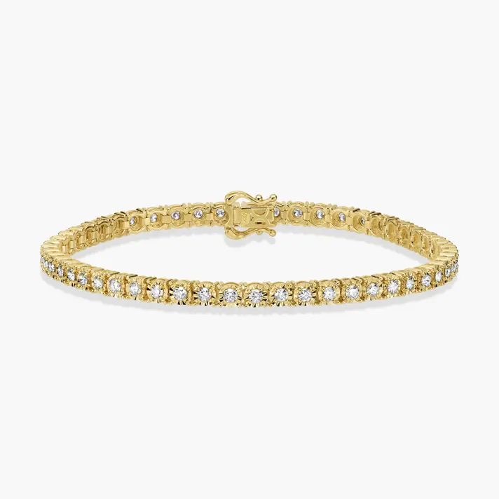 צמיד טניס זהב משובץ יהלומים במשקל של מעל ל 2 קראט, באורך 19.5 ס"מ ובעובי 3.7 מ"מ. פריט חובה לכל חובבת תכשיטים.