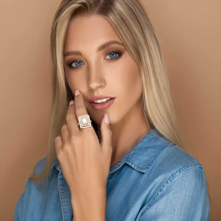 טבעת זהב מרשימה מאוד בעלת חלק עליון מרובע משובץ ב 141 יהלומים טבעיים ונוצצים במשקל 1.14 קראט. במרכז הטבעת יהלומי באגט. רוחב החלק העליון 1.5 ס"מ והאורך 2 ס"מ