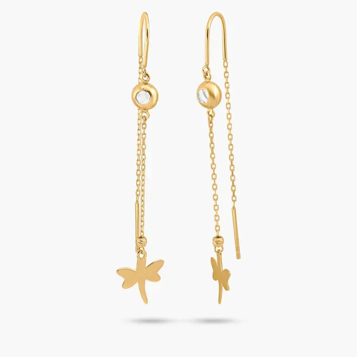 עגילים תלויים- עשויים זהב 14K צהוב עם סיומת של שפירית. אורך העגיל 6 ס"מ.