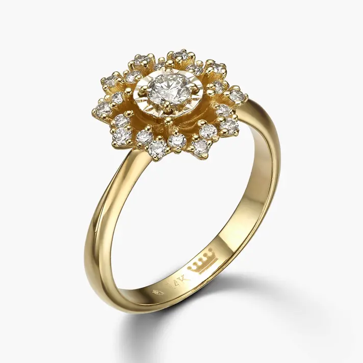 טבעת פרח עשויה מזהב 14K בצורת פרח ומשובצת ב 21 יהלומים טבעיים ונוצצים. מידות הטבעת: קוטר ראש הטבעת 1.3 ס"מ. קוטר עיגול פנימי 0.7 ס"מ. עובי הטבעת 1.5 מ"מ