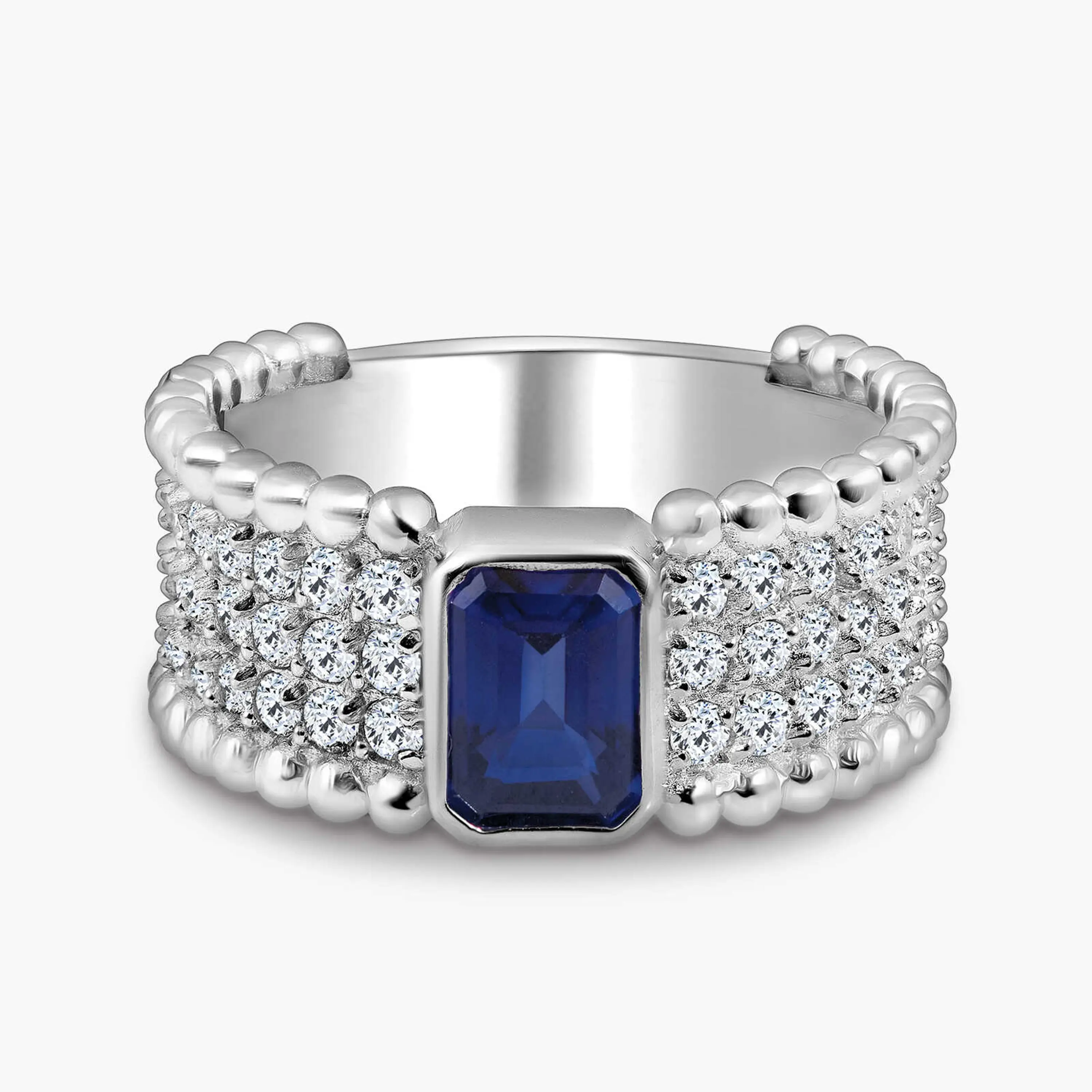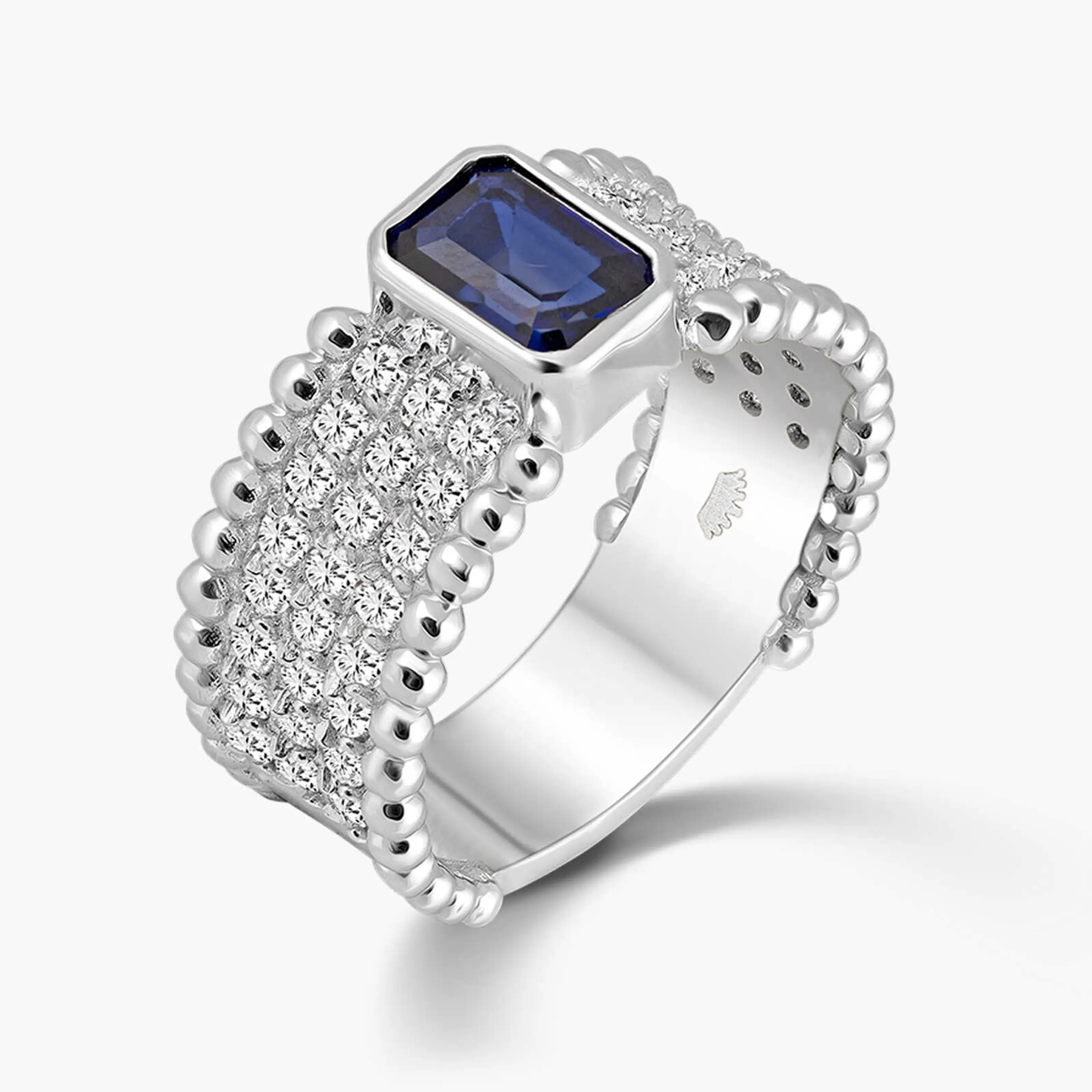 טבעת זהב 14K בשיבוץ שלוש שורות בהן שובצו 48 יהלומים טבעיים ונוצצים עם אבן בלו ספיר מרכזית.