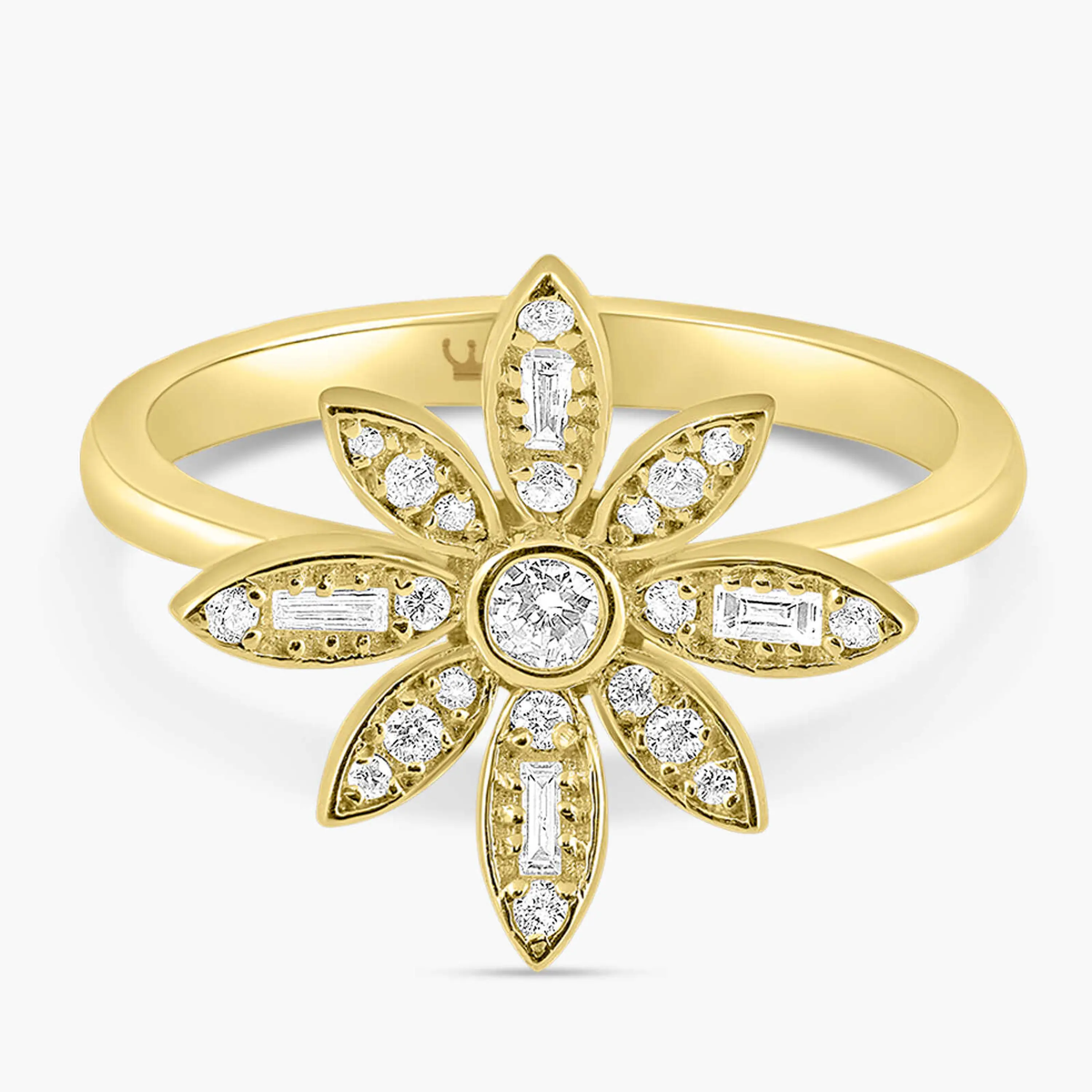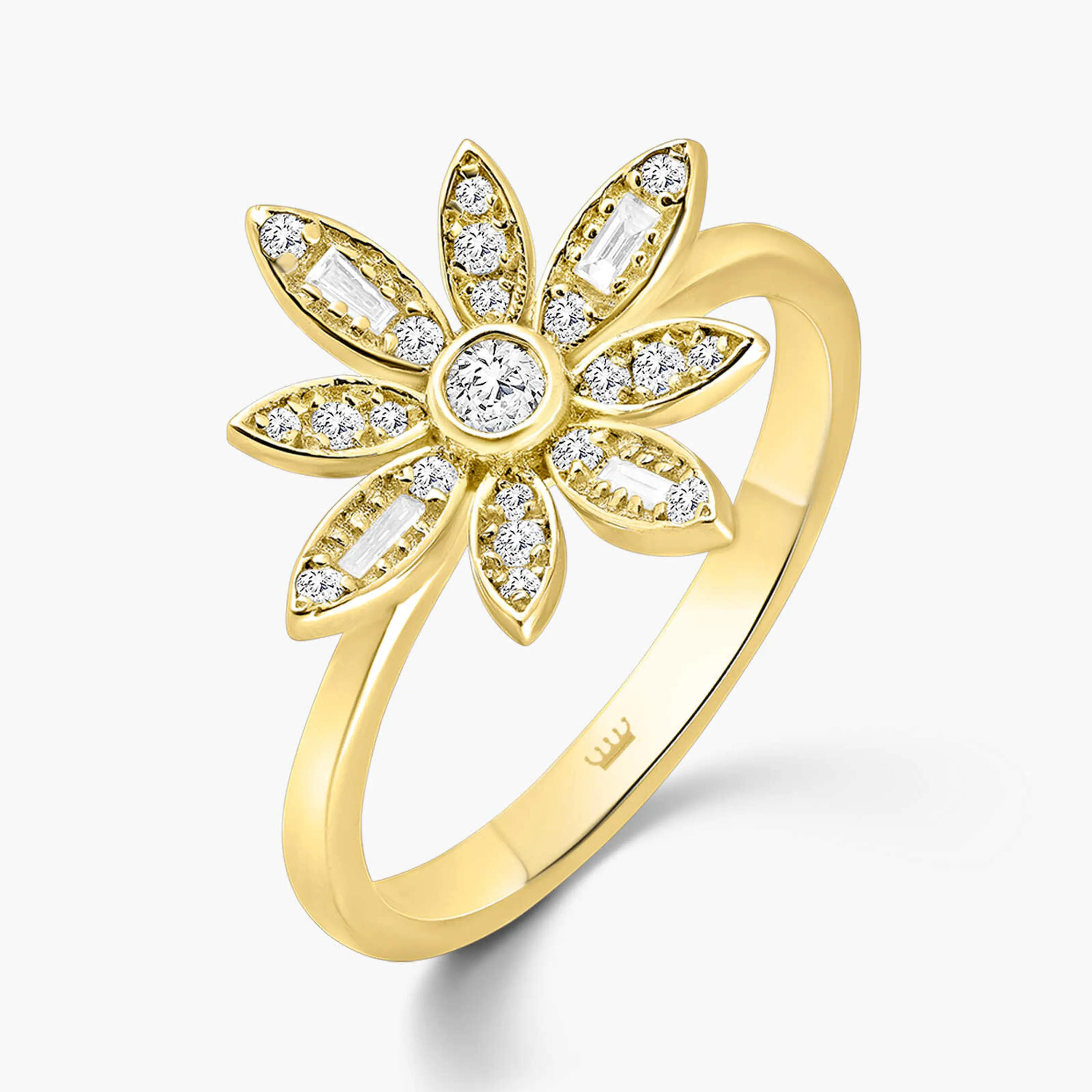 טבעת סביון מזהב 14K בצורת פרח ובשיבוץ 25 יהלומים טבעיים ונוצצים. קוטר הפרח 1.3 ס"מ.