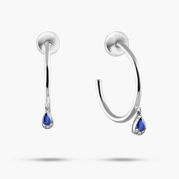 עגילי זהב 14K חישוק פתוח עם טיפות ספירים כחולים ו 6 יהלומים טבעיים ונוצצים.