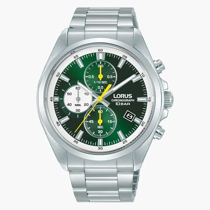 שעון לורוס לגבר מבית Seiko יפן. לשעון מנגנון קוורץ. לוח השעון בגוון ירוק וכולל תאריכון וכרונוגרף 1/100 שניות. מחוגי השעון בגוון צהוב שבולט בבירור על הלוח ויחד עם זרחנים מאפשר קריאה בקלות. לשעון זכוכית מינרלית , גוף השעון והצמיד עשויים פלדת אל חלד איכותית. קוטר השעון 42 מ"מ והוא עמיד במים עד 100 מ'.