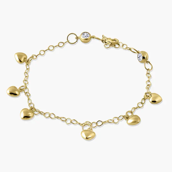 צמיד זהב 14K משולב 6 צ'ארמים של לבבות ובשיבוץ שני זרקונים. אורך הצמיד 17.5 ס"מ + 2.5 ס"מ הארכה נוספים.