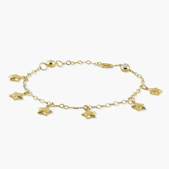 צמיד זהב 14K משולב 6 כוכבי צ'ארמים ובשיבוץ שני זרקונים. אורך הצמיד 17.5 ס"מ + 2.5 ס"מ הארכה נוספים.