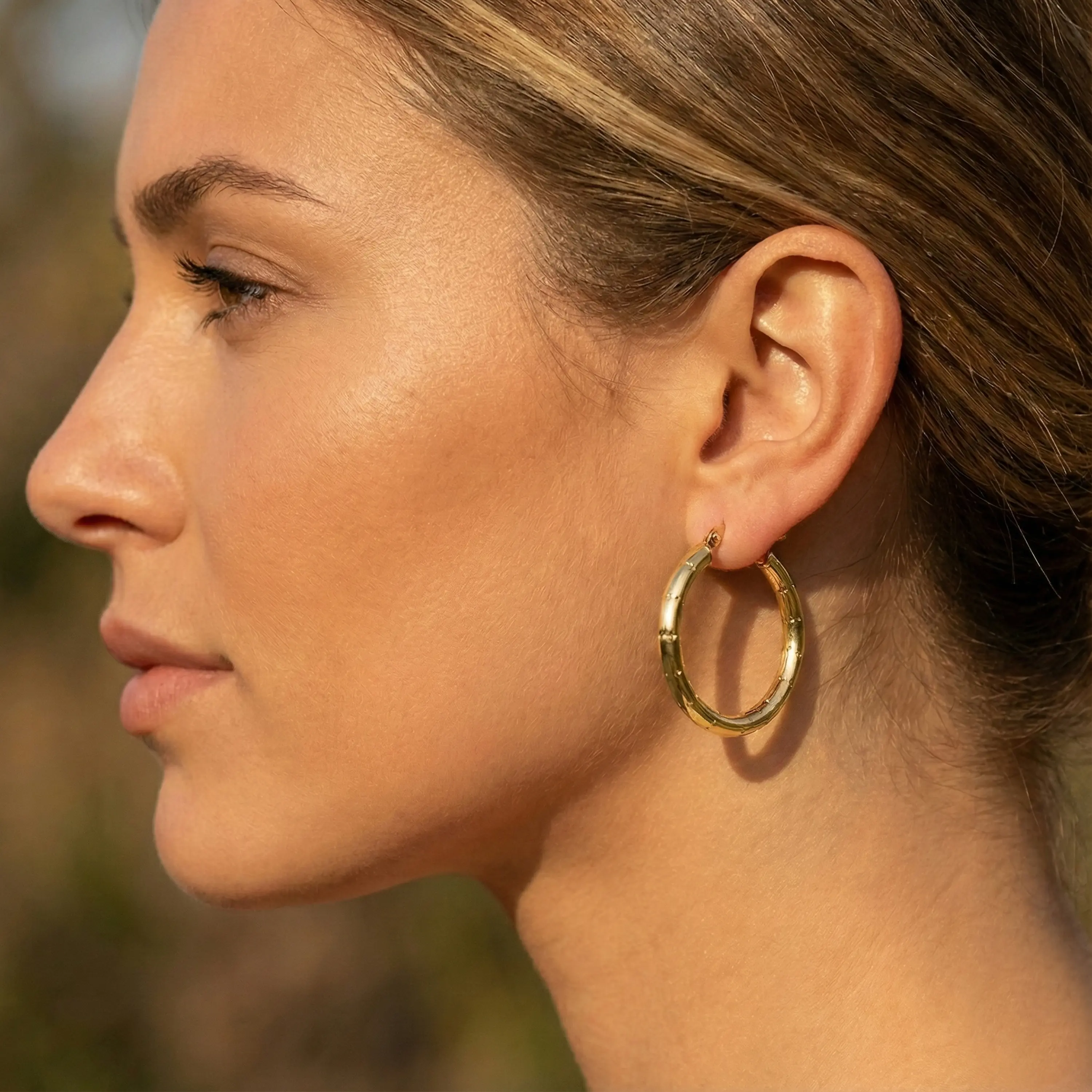 עגילי חישוקי זהב 14K בעיצוב טקסטורלי ייחודי בהשראת תנועה טבעית של אור עם נגיעות של נקודות עדינות שמעניקות להם אופי שובה לב ומראה בלתי שגרתי. שילוב מדויק של עידון וסטייל, שמתאים לכל שעה ולכל הופעה. העגילים מצטרפים לקולקציית DAY AND NIGHT המתאימה 24-7. קוטר העגילים 3.5 ס"מ.