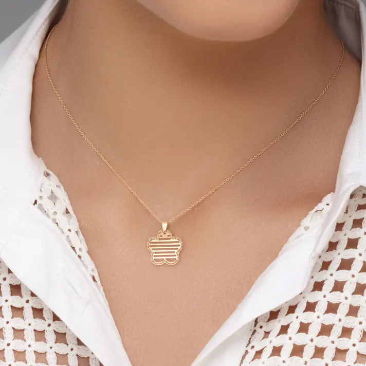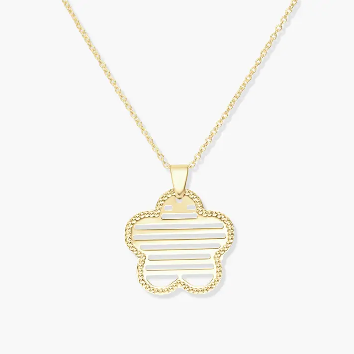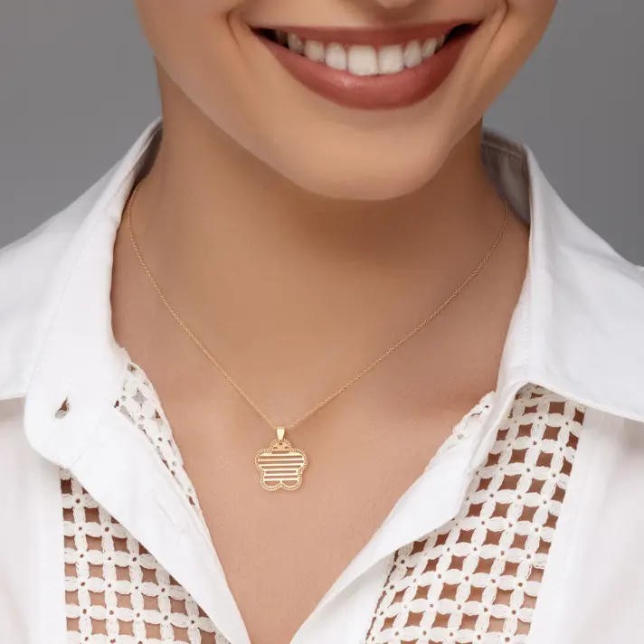 תליון זהב 14K בצורת פרח מוקף בזהב בעיבוד לייזר ובתוכו פסי זהב בעיבוד זהב מבריק. קוטר התליון 1.7 ס"מ.