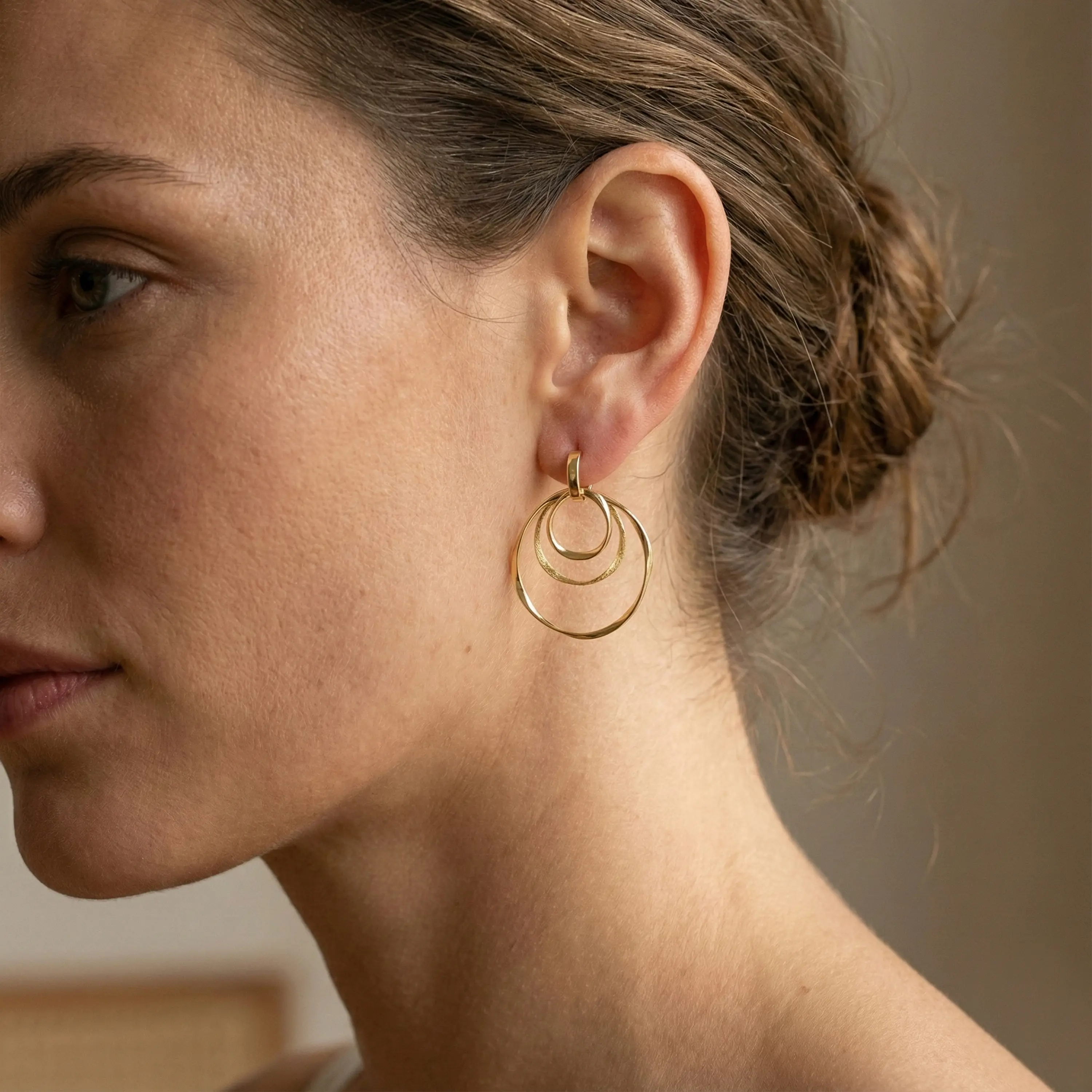 עגילי זהב 14K בעיצוב תלת שכבתי של שלוש חישוקים