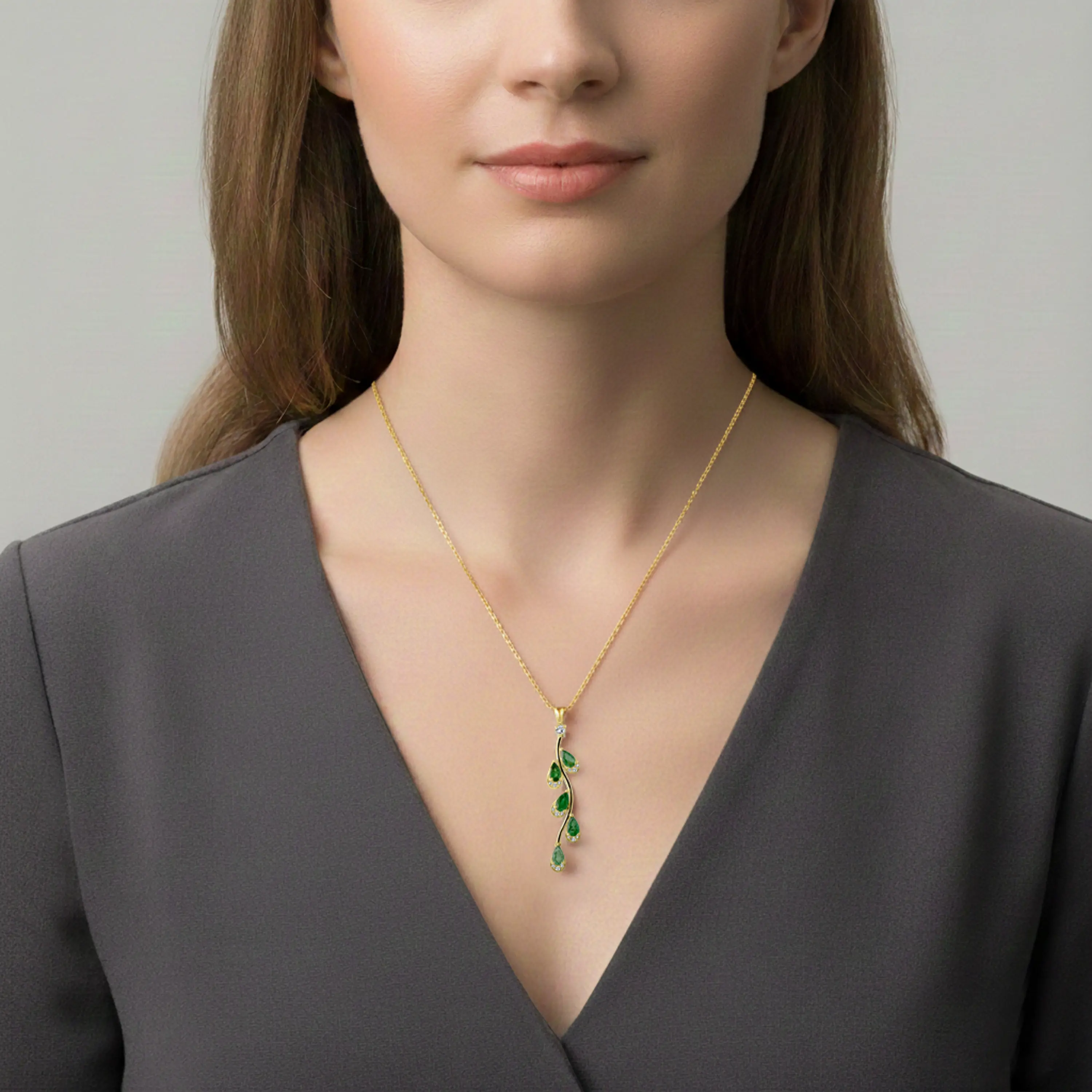 על גבי התליון שובצו חמישה אבני אמרלד טבעיות בחיתוך טיפה, כל אחת עטופה במסגרת זהב מעודנת ומשובצת 16 יהלומים טבעיים ונוצצים להוספת ברק ונוכחות.