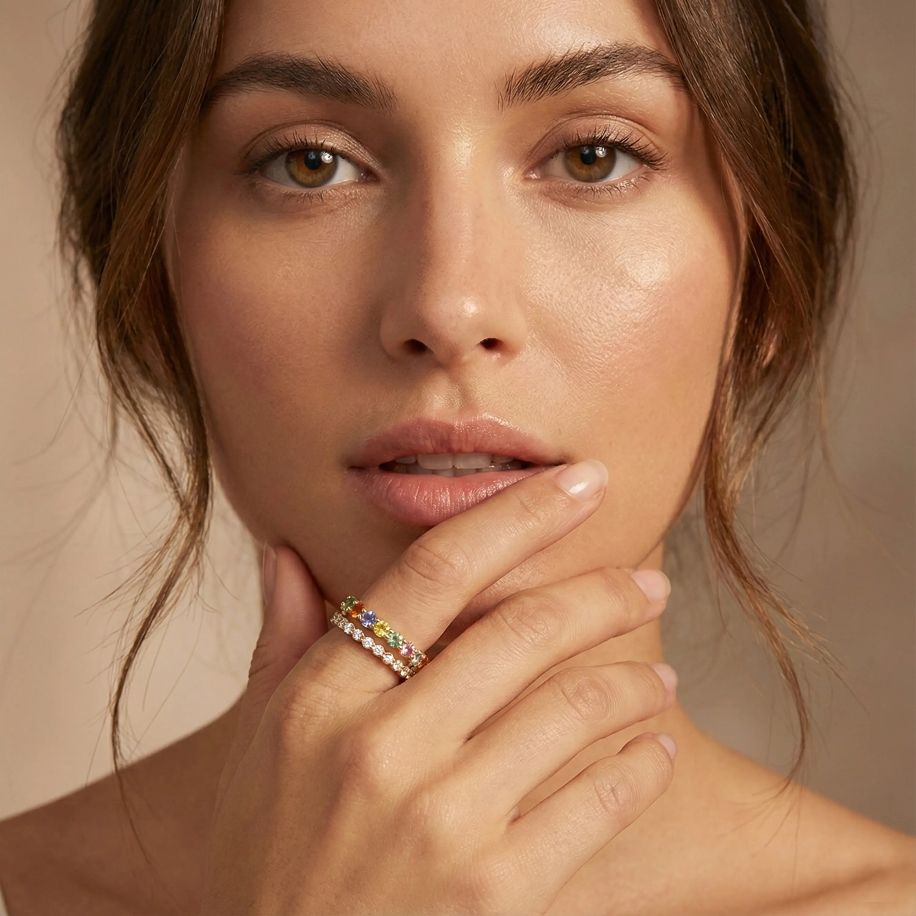 טבעת זהב 14K מקולקציית ה RAINBOW, בעיצוב כפול בצורת גל, המשובצת 23 יהלומים טבעיים ונוצצים ו-11 אבני חן צבעוניות במגוון גוונים: ורוד, כתום, צהוב, ירוק, תכלת וסגול. העיצוב הרענן והחגיגי מדגיש את נוכחות הצבעים ויוצר עיצוב קלאסי- עדכני.