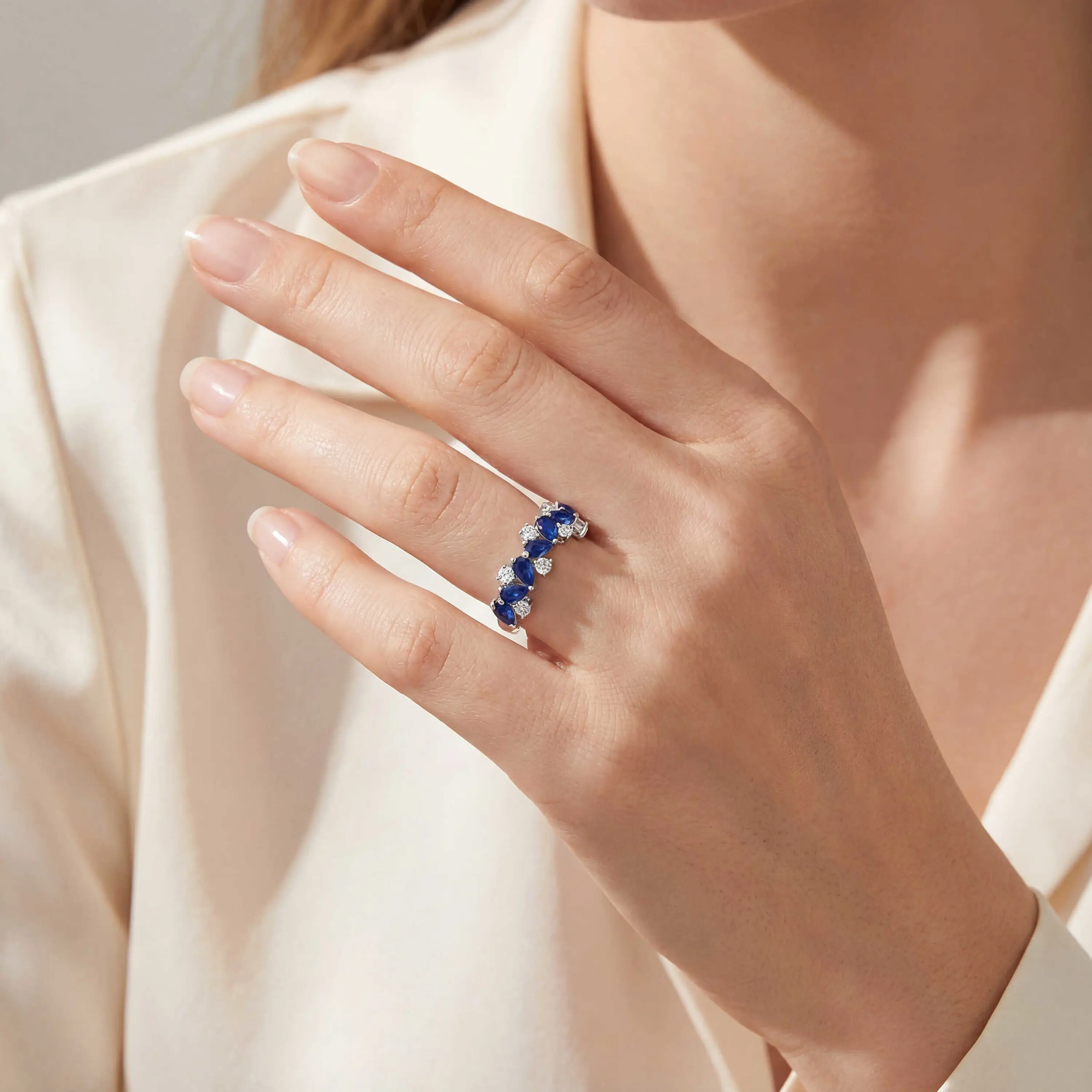 טבעת יוקרתית מזהב לבן 14K, משובצת 8 אבני ספיר כחולות בחיתוך טיפה, ו-7 יהלומים טבעיים בחיתוך עגול. שילוב האבנים המדויק והמעודן מעניק לטבעת מראה דרמטי ואלגנטי, עשיר בנוכחות וזוהר.