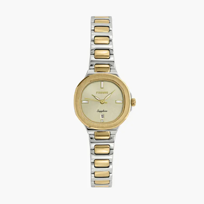 שעון פרארי נשים, עם לוח עדכני בצורה מרובעת- עם פינות מעוגלות הנקראת גם Cushion (כרית). זהו שילוב הרמוני בין ריבוע לעיגול עם קווים רכים שמקנים מראה אלגנטי, נשי ונעים לעין, אך עדיין שומרים על מבנה גאומטרי מוגדר. לוח השעון בגוון שמפנייה המשתלב בצורה הרמונית עם צמיד עשוי פלדת אל חלד בגווני זהב- כסף. לוח השעון מינימליסטי נקי וכולל סימוני ספרות של השעות 3,6,9,12 בשיבוץ זרקונים נוצצים ותאריכון. לשעון זכוכית ספיר קריסטל למניעת שריטות ועמידות במים לשטיפת ידיים בלבד.