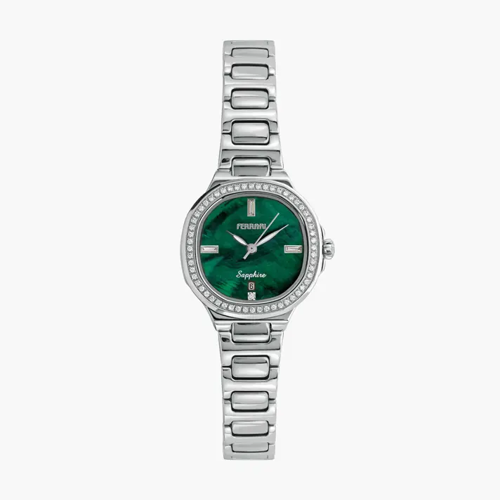שעון פרארי נשים, עם לוח עדכני בצורה מרובעת- עם פינות מעוגלות הנקראת גם Cushion (כרית). זהו שילוב הרמוני בין ריבוע לעיגול עם קווים רכים שמקנים מראה אלגנטי, נשי ונעים לעין, אך עדיין שומרים על מבנה גאומטרי מוגדר. לוח השעון בגוון ירוק עמוק המשתלב בצורה הרמונית עם מסגרת חיצונית המשובצת זרקונים נוצצים לכל אורכה וצמיד עשוי פלדת אל חלד בגוון כסוף. לוח השעון מינימליסטי נקי וכולל סימוני ספרות של השעות 3,6,9,12 בשיבוץ זרקונים נוצצים ותאריכון. לשעון זכוכית ספיר קריסטל למניעת שריטות ועמידות במים לשטיפת ידיים בלבד.