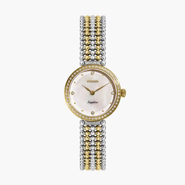 שעון FERRARI נשים עגול עם מנגנון קוורץ, לוח עשוי אם הפנינה עם מסגרת פנימית בצבע בז' תלת מימדית להוספת עומק ושיבוץ זרקונים נוצצים\ כדורים בצבע זהב . גוף השעון והצמיד עשויים פלדת אל חלד איכותית בגוון זהוב- כסוף עם שיבוץ זרקונים נוצצים בחלקו החיצוני למראה נוצץ במיוחד. לשעון זכוכית ספיר קריסטל למניעת שריטות ועמידות לשטיפת ידיים בלבד. קוטר השעון 26 מ"מ.