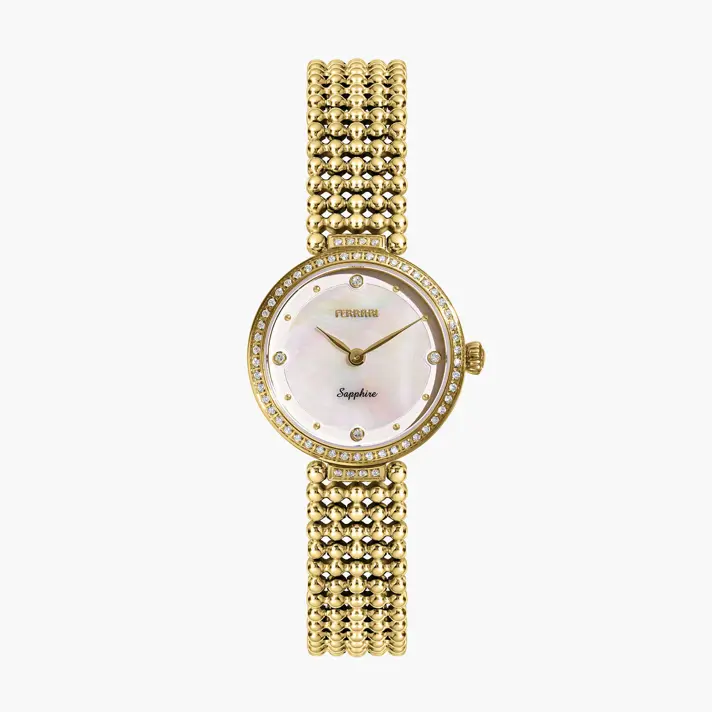שעון FERRARI נשים עגול עם מנגנון קוורץ, לוח עשוי אם הפנינה עם מסגרת פנימית בצבע בז' תלת מימדית להוספת עומק ושיבוץ זרקונים נוצצים\ כדורים בצבע זהב . גוף השעון והצמיד עשויים פלדת אל חלד איכותית בגוון זהוב עם שיבוץ זרקונים נוצצים בחלקו החיצוני למראה נוצץ במיוחד. לשעון זכוכית ספיר קריסטל למניעת שריטות ועמידות לשטיפת ידיים בלבד. קוטר השעון 26 מ"מ.