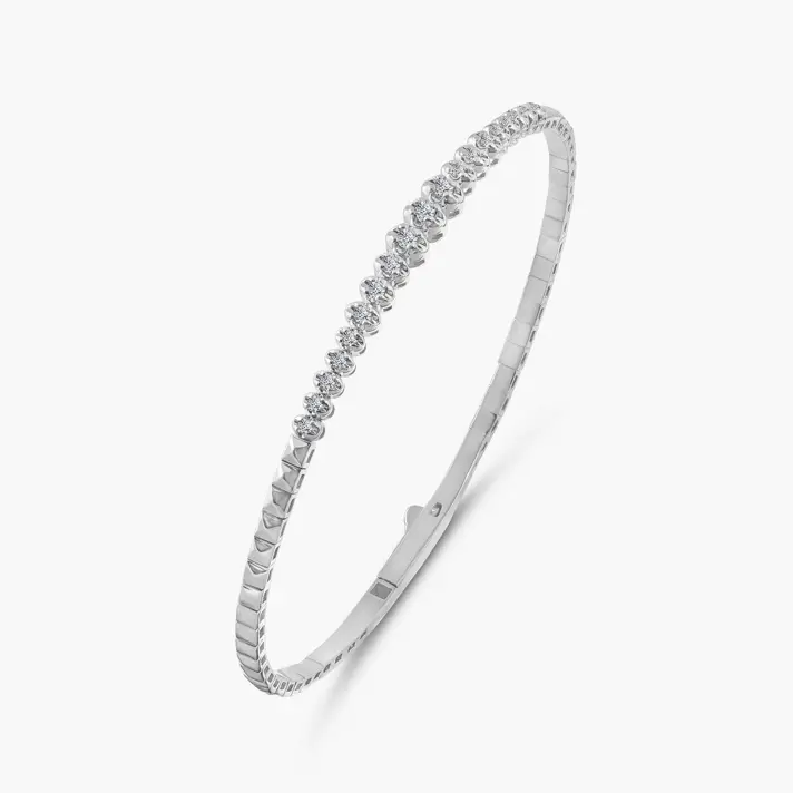 צמיד קשיח במראה אלגנטי עשוי זהב 14K, משובץ ב 19 יהלומים טבעיים נוצצים . החלק התחתון מעוטר בדוגמה גיאומטרית מרובעת המוסיפה ניחוח עכשווי לעיצוב הקלאסי. תכשיט יוקרתי שמחמיא לכל הופעה – לבדו או בשילוב צמידים נוספים.