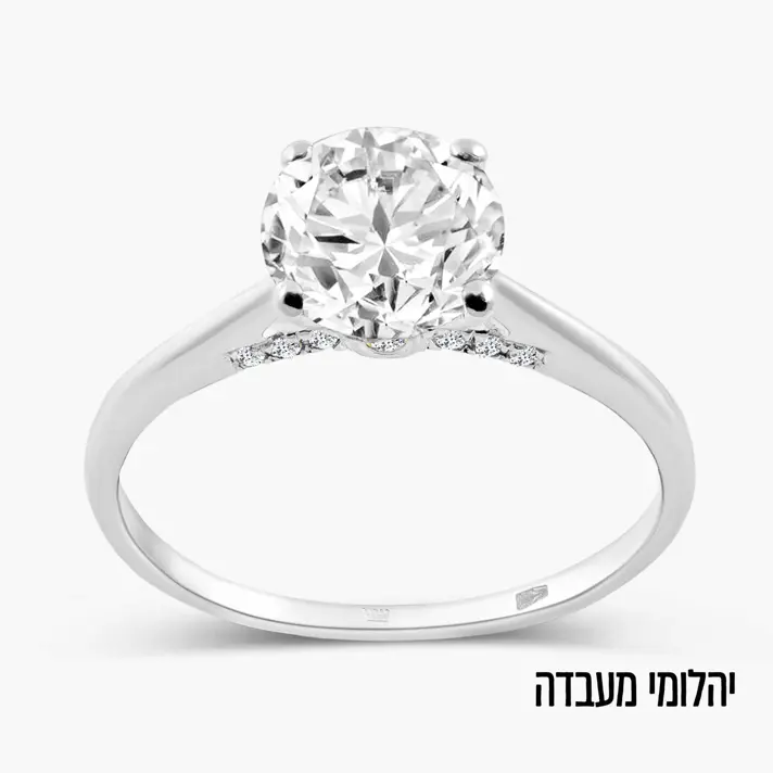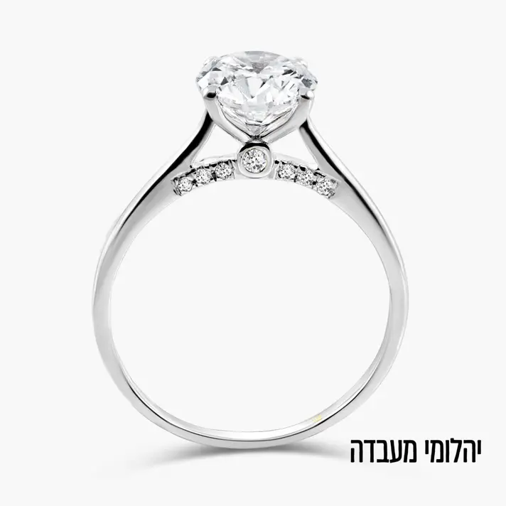 טבעת זהב 14K בעיצוב אלגנטי עם יהלום מעבדה מרכזי וליווי של יהלומי צד עדינים. הטבעת משלבת אבן מרכזית עגולה הנתמכת בשיבוץ קלאסי בעל ארבע שיניים, ומתחתיה קשת של 14 יהלומי מעבדה קטנים, כולל יהלום מרכזי ליצירת אפקט מפתיע ומרשים מכל זווית מבט. עיצוב נקי עם נגיעה מקורית.