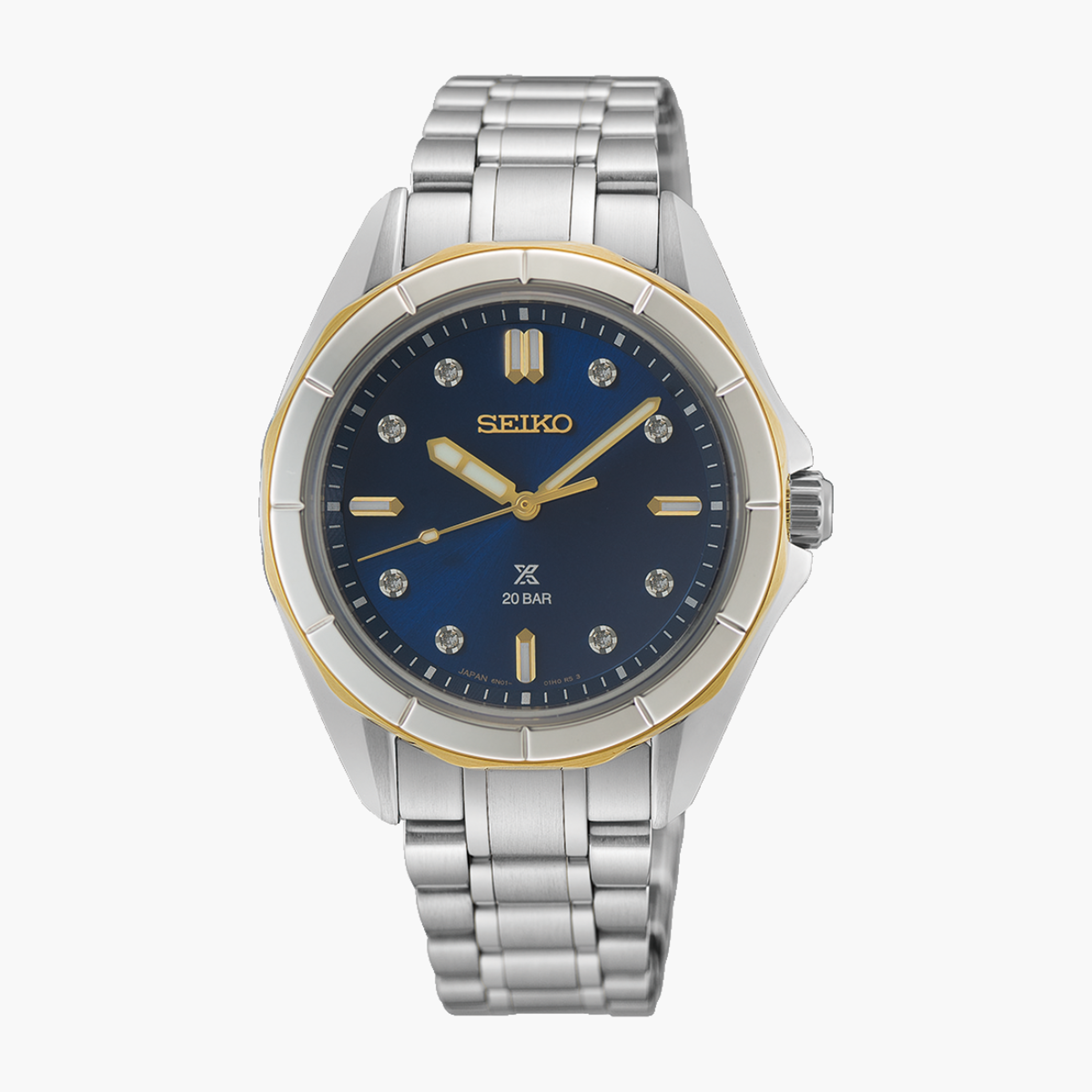 שעון Seiko Prospex לנשים המצטרף לקולקציית Sea של Prospex, בעיצוב מוקפד שמאזן בין קווים קלאסיים למראה ספורטיבי יומיומי. גוף השעון עשוי פלדת אל-חלד בגימור מלוטש, בקוטר 34.0 מ"מ מימדים אידאליים לפרק כף היד הנשי. לוח השעון בגוון כחול עמוק עם גימור מט עדין, כולל אינדקסים משובצי יהלומים קטנים שמשדרים אלגנטיות מעודנת. המחוגים מצופים זרחני LumiBrite לקריאות מיטבית גם בתנאי תאורה חלשים. מנגנון השעון הוא שעון Seiko Prospex לנשים המצטרף לקולקציית Sea של Prospex, בעיצוב מוקפד שמאזן בין קווים קלאסיים למראה ספורטיבי יומיומי. גוף השעון עשוי פלדת אל-חלד בגימור מלוטש, בקוטר 34.0 מ"מ מימדים אידאליים לפרק כף היד הנשי. לוח השעון בגוון לבן-כסוף עם גימור מט עדין, כולל אינדקסים משובצי יהלומים קטנים שמשדרים אלגנטיות מעודנת. המחוגים מצופים חומר זרחני LumiBrite לקריאות מיטבית גם בתנאי תאורה חלשים. מנגנון השעון הוא 6N01 קוורץ. השעון כולל זכוכית ספיר קריסטל עם ציפוי אנטי-רפלקטיבי פנימי לקריאה בתנאי תאורה משתנים והוא עמיד במים עד 200 מטר, ומתאים גם לפעילויות ימיות יומיומיות. הצמיד עשוי פלדת אל-חלד בגוון זהוב- כסוף עם סוגר פרפר מתקדם בעל מנגנון לחצנים, המעניק נוחות ועמידות לאורך זמן.