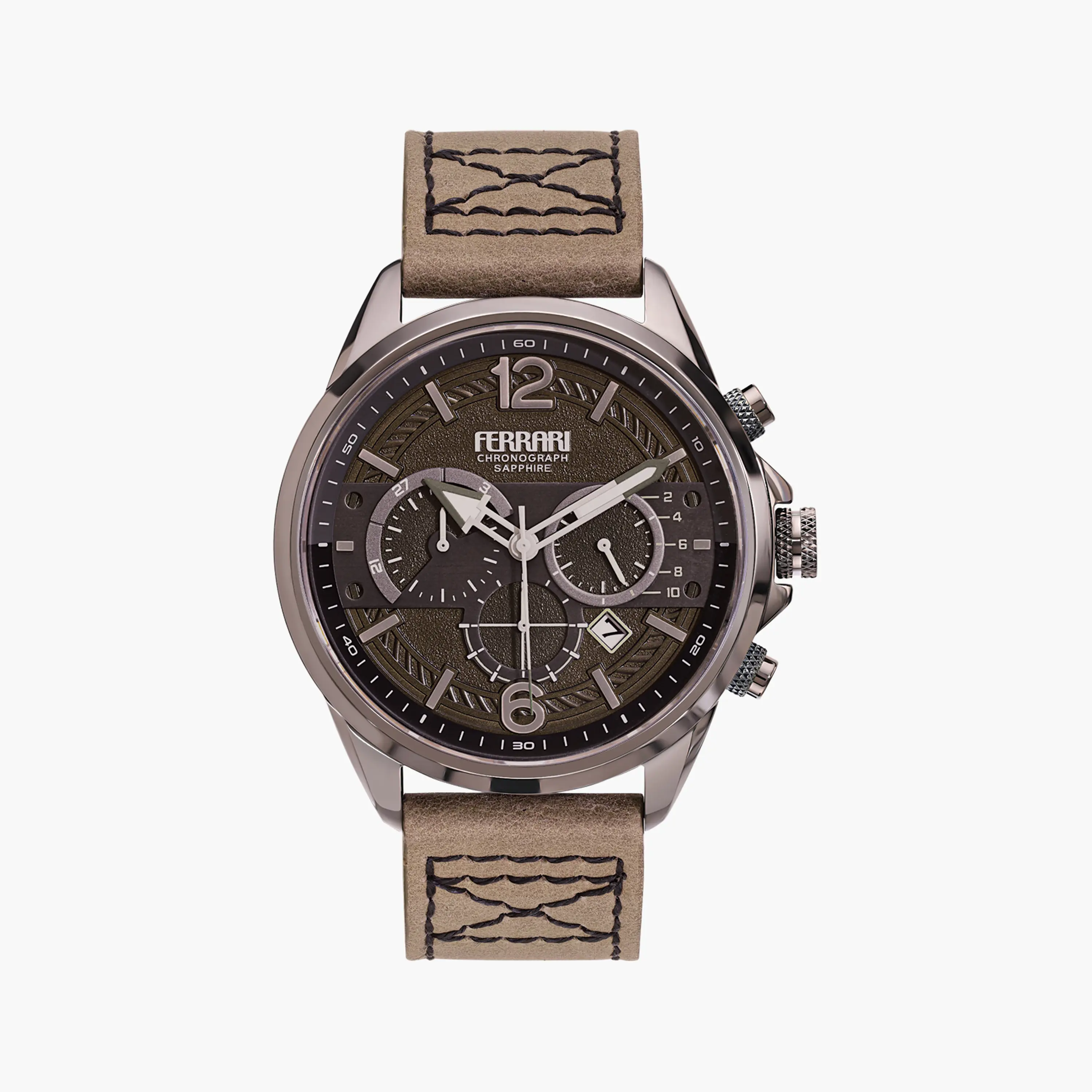 שעון FERRARI לגברים, עם מנגנון JS26 כרונוגרף, לוח בגוון חום ,זכוכית ספיר קריסטל למניעת שריטות, תאריכון, רצועת עור איכותית בגוון חום כאמל בהיר עם תיפורים שחורים. קוטר השעון 45 מ"מ. גוף השעון עשוי פלדת אל חלד איכותית.