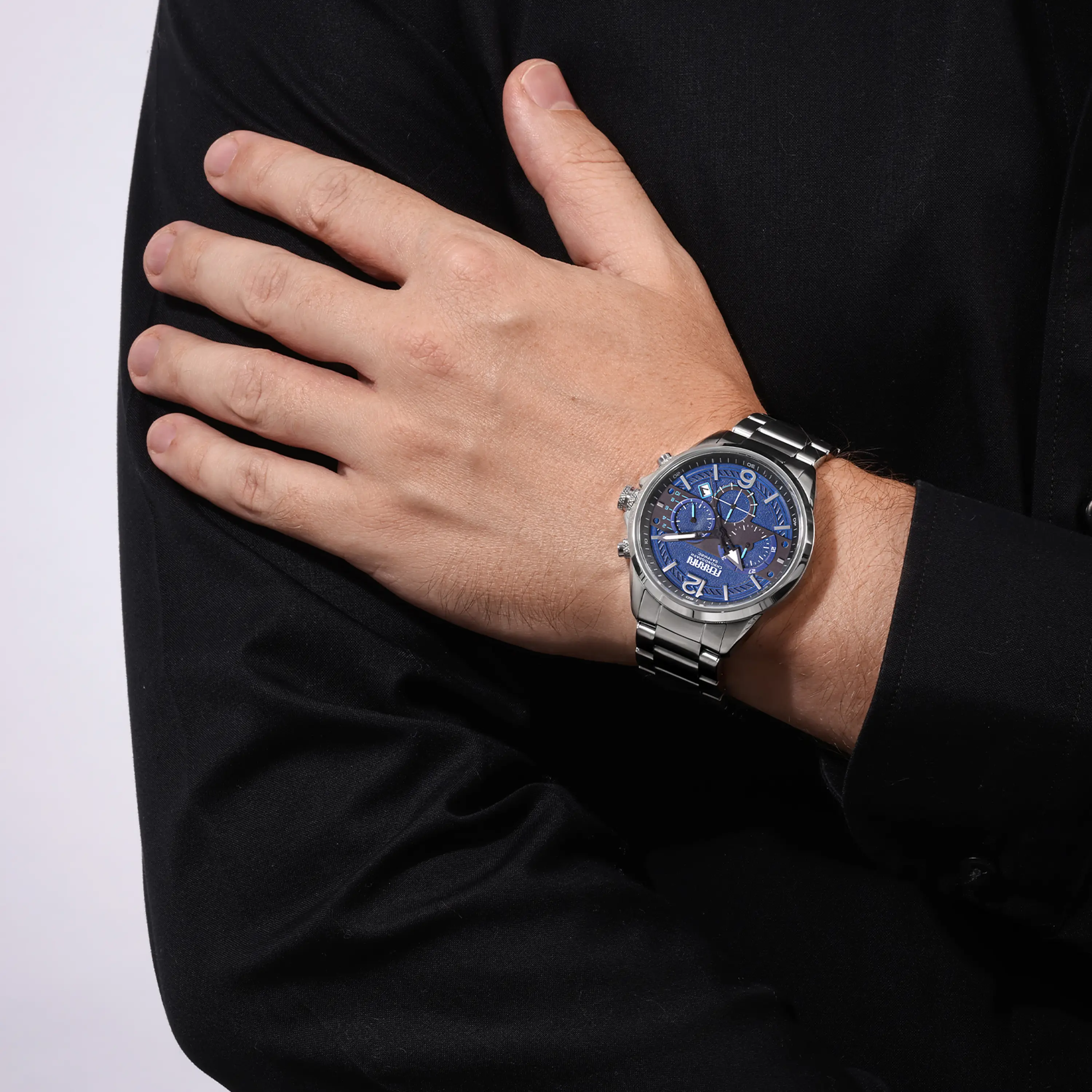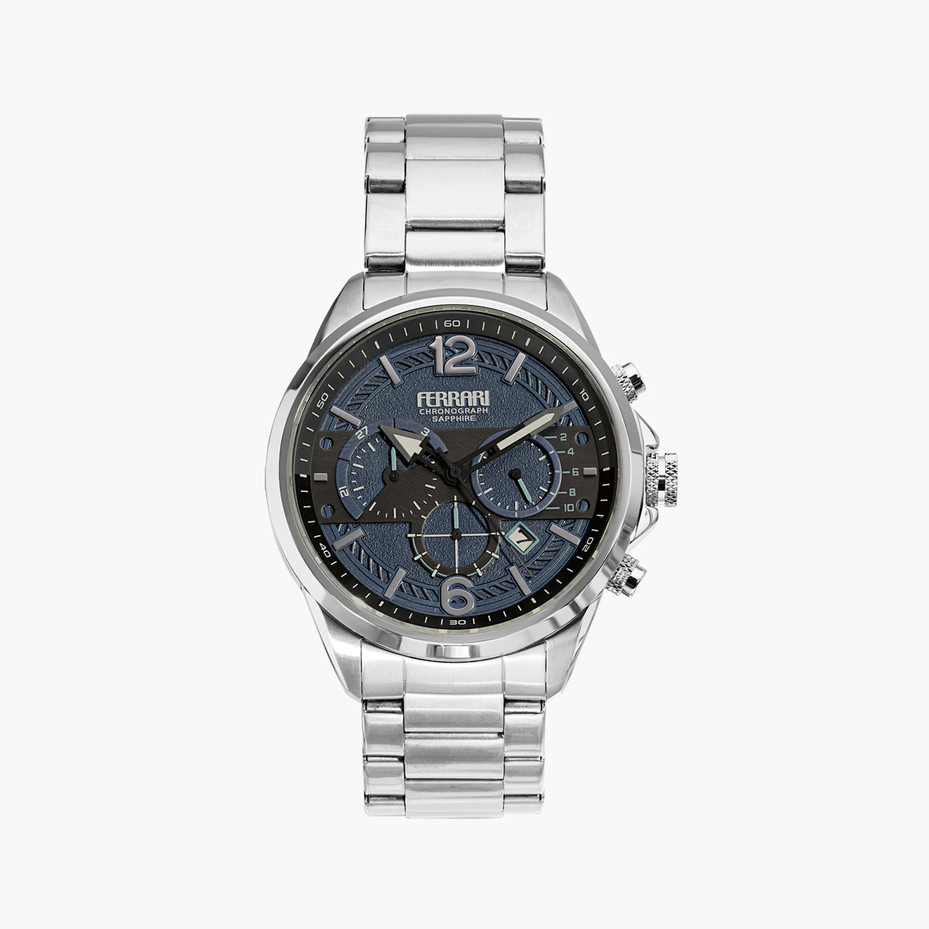 שעון FERRARI לגברים, עם מנגנון JS26 כרונוגרף, לוח בגוון כחול עמוק ,זכוכית ספיר קריסטל למניעת שריטות, תאריכון ושלוש תתי שעונים לכרונוגרף. גוף השעון והצמיד עשויים פלדת אל חלד איכותית. קוטר השעון 45 מ"מ.