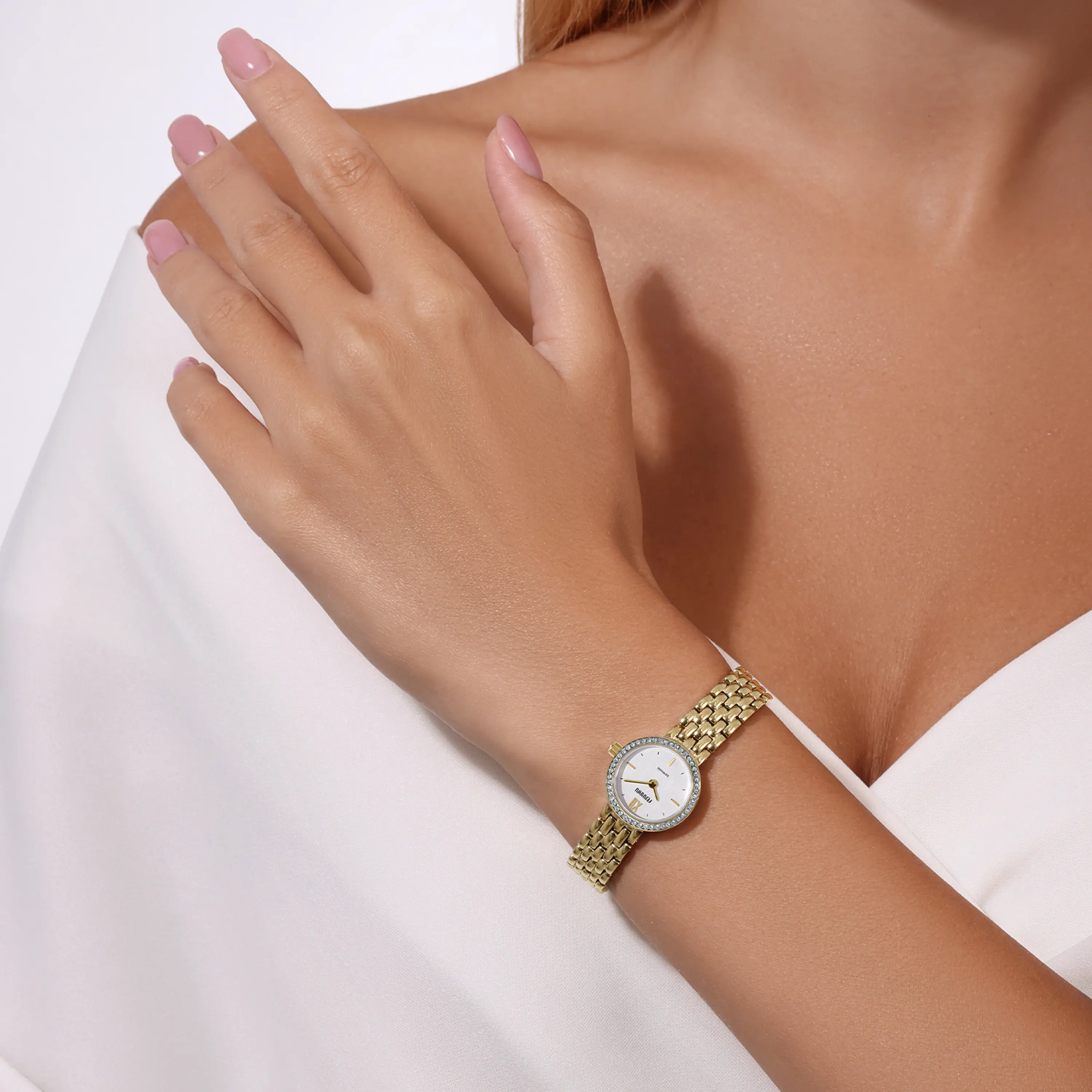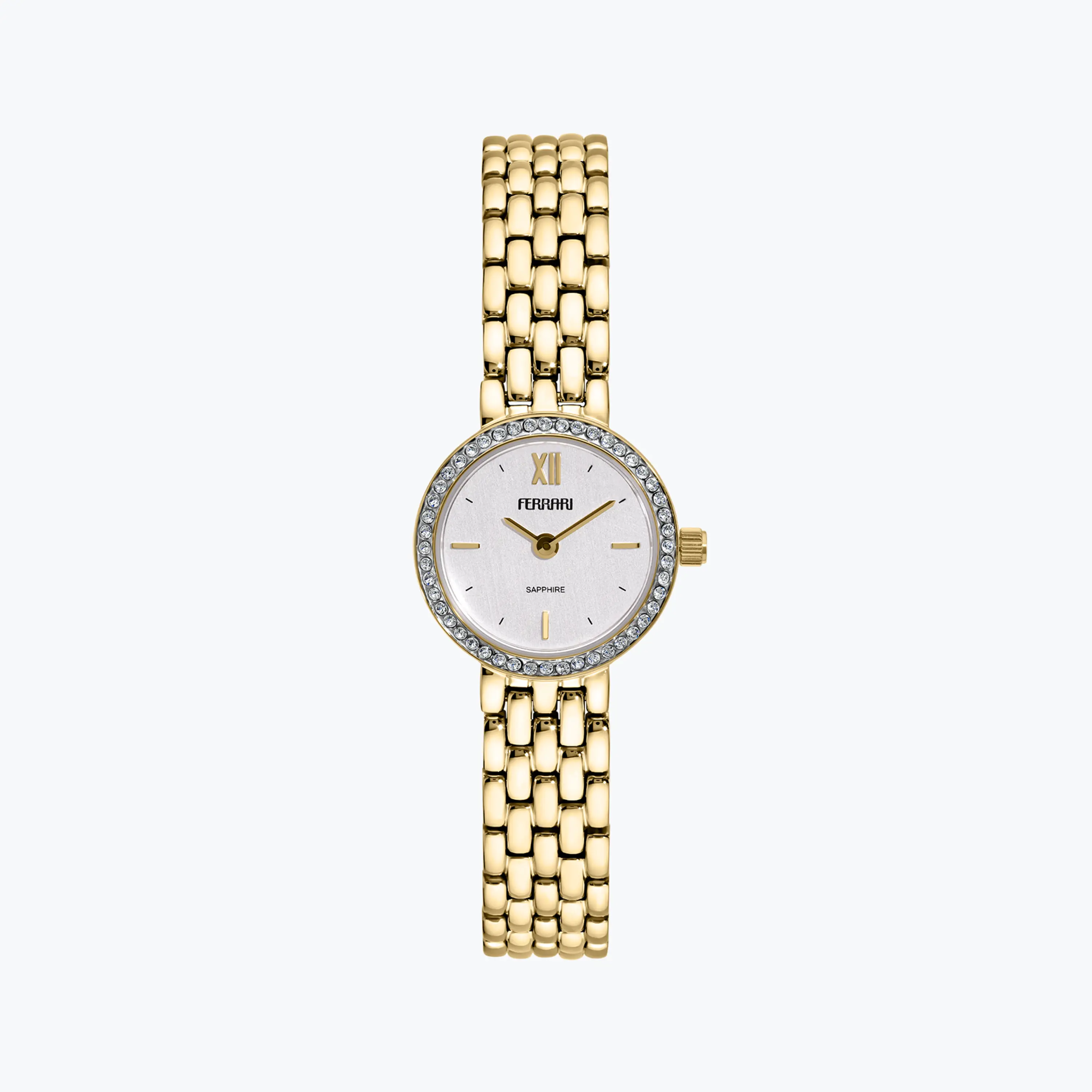 שעון FERRARI קלאסי לנשים, עם מנגנון SY20 קוורץ. לוח השעון בגוון כסוף- לבן. גוף השעון והצמיד עשויים פלדת אל חלד איכותית בגוון זהוב ובקוטר 26 מ"מ. סביב לוח השעון משובצים קריסטלים נוצצים.