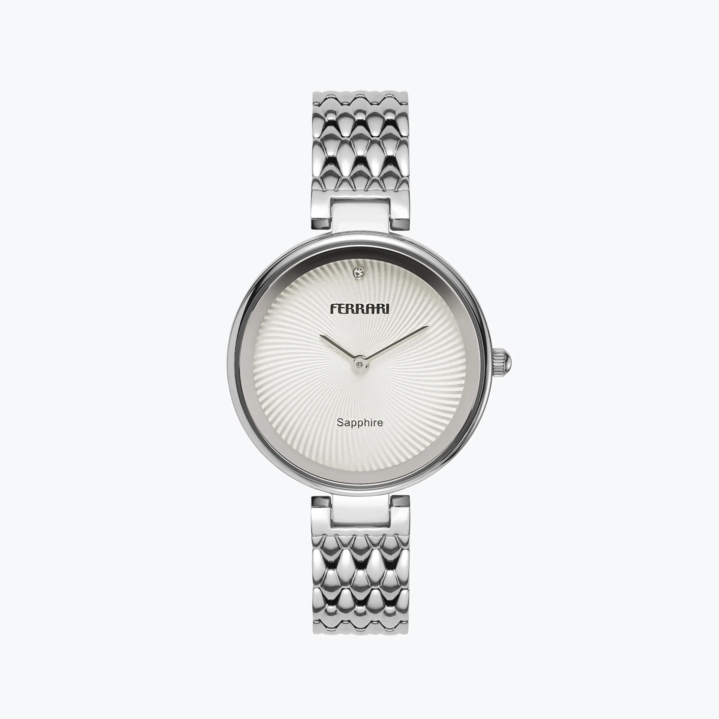 שעון FERRARI עגול נשי וקלאסי עם טוויסט עכשווי. לשעון מנגנון VJ20 קוורץ. לוח השעון בגוון כסוף- לבן, אבן קריסטל בשעה 12 וטקסטורה ספיראלית המוסיפה עניין ועדיין שומרת על הרמוניה ויזואלית. לשעון זכוכית ספיר קריסטל למניעת שריטות, גוף השעון והצמיד עשויים שניהם מפלדת אל חלד איכותית. השעון עמיד במים לשטיפת ידיים בלבד.