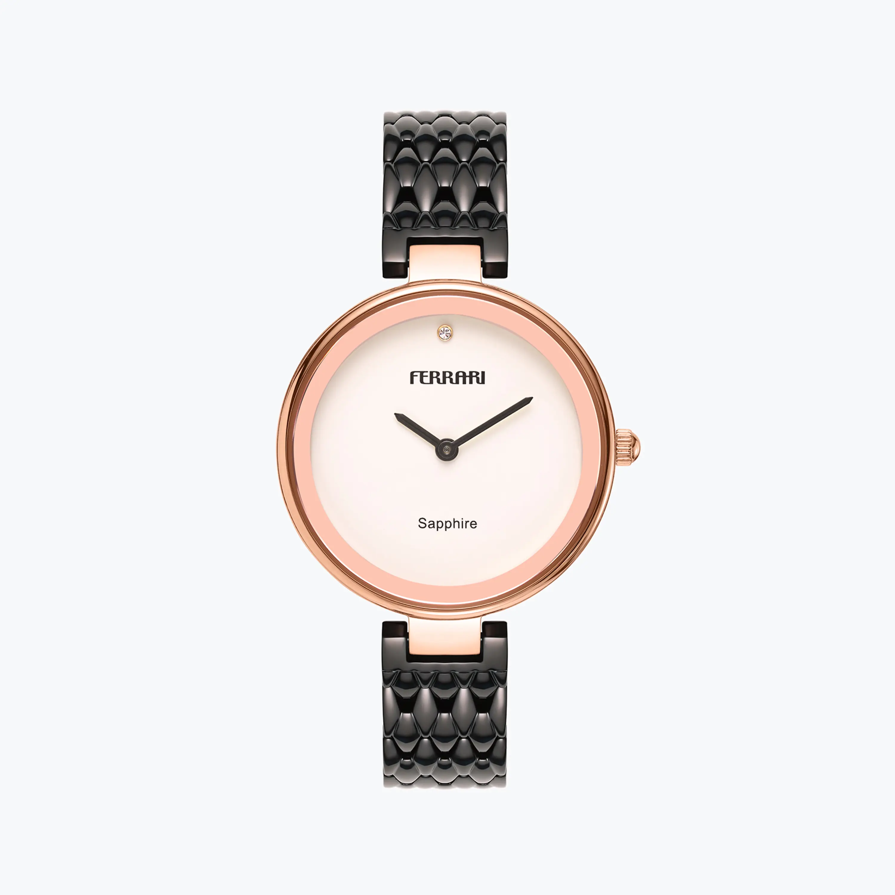 שעון FERRARI עגול במראה מתוחכם, נקי ומינימליסטי. לשעון מנגנון VJ20 קוורץ. לוח השעון החלק בגוון לבן ומשובץ אבן קריסטל בשעה 12. לשעון זכוכית ספיר קריסטל למניעת שריטות, גוף השעון עשוי פלדת אל חלד איכותית בגוון שחור. גם גוף השעון עשוי פלדת אל חלד, הפעם בגוון רוז גולד. השעון עמיד במים לשטיפת ידיים בלבד.