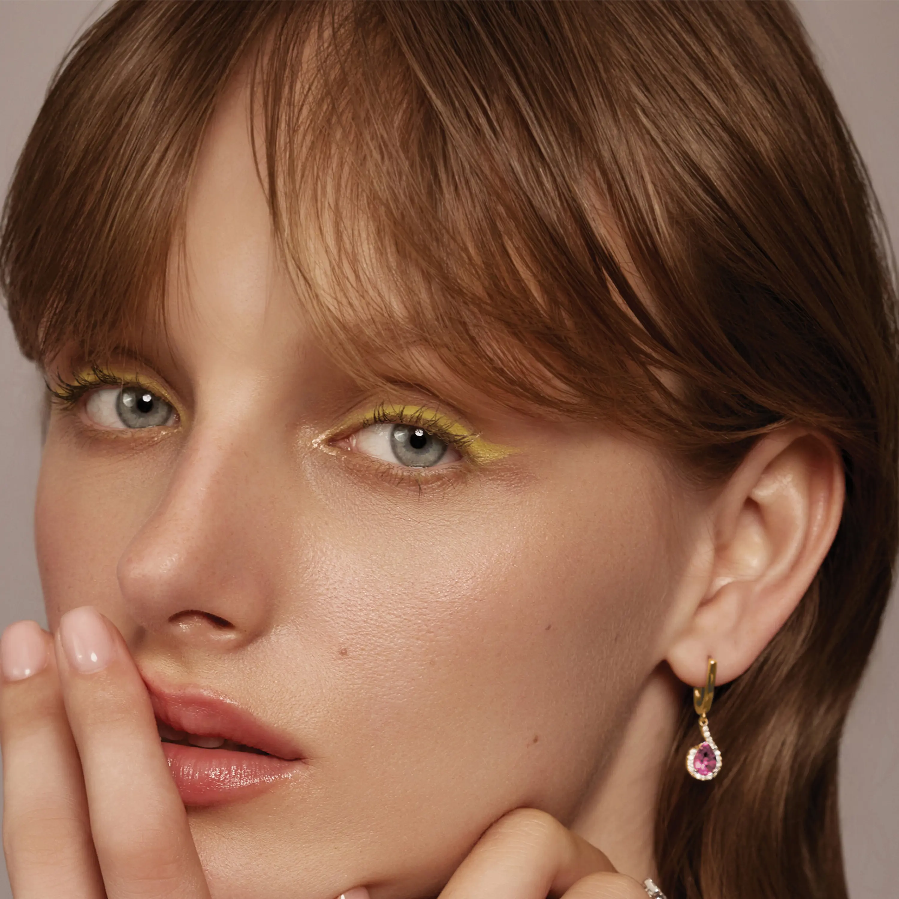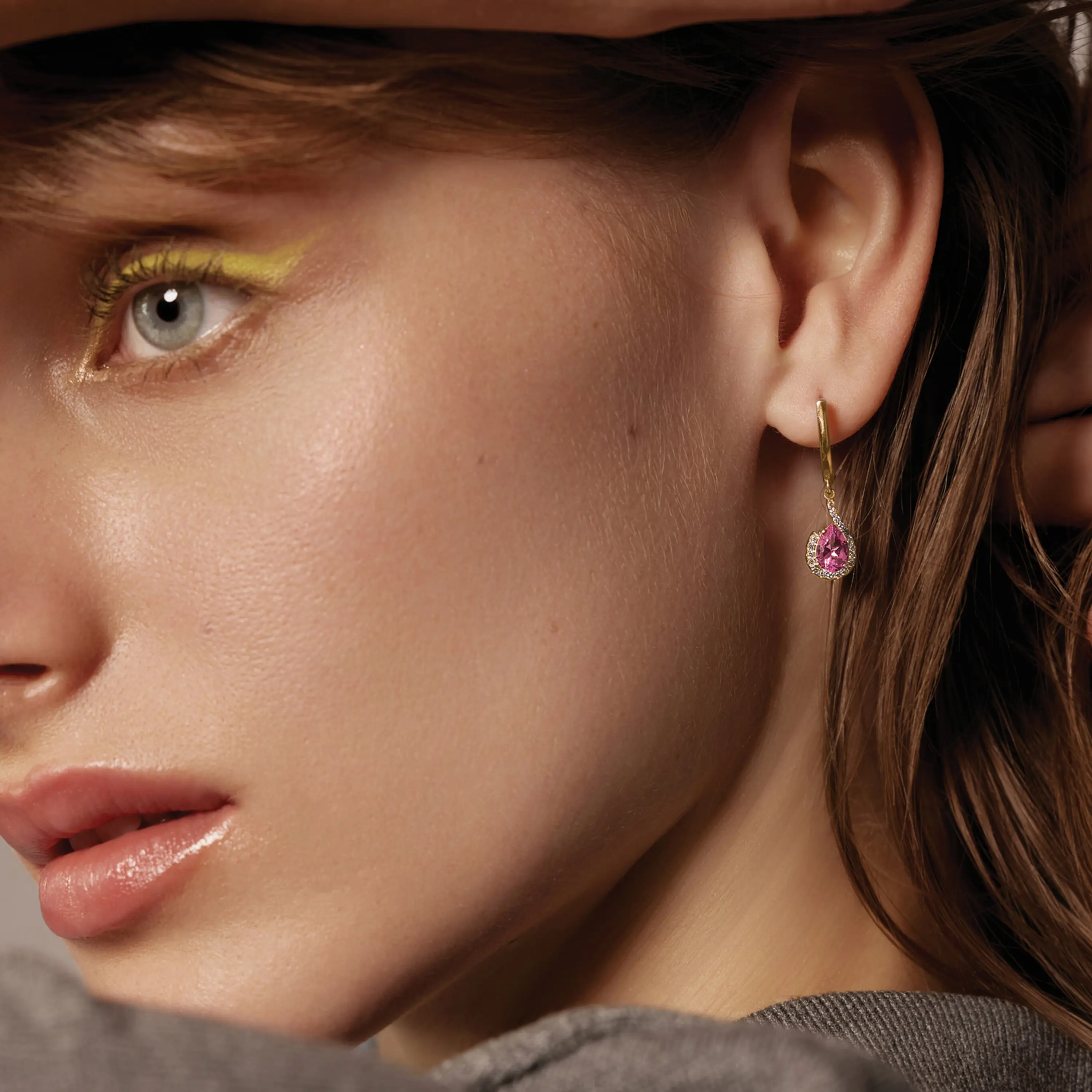 עגילי זהב 14K מסדרת Lumiere – בהשראת ההמפגש בין זוהר היהלומים לעומק הצבע של אבן החן, בעיצוב טיפה פתוחה שמדמה תנועה רכה ואור עדין. העגילים משובצים 36 יהלומים טבעיים המקיפים אבן חן מרכזית מסוג ספיר ורודה התלויה בעדינות. עגיל קליל, נשי ומדויק – מלא אור בכל תנועה.