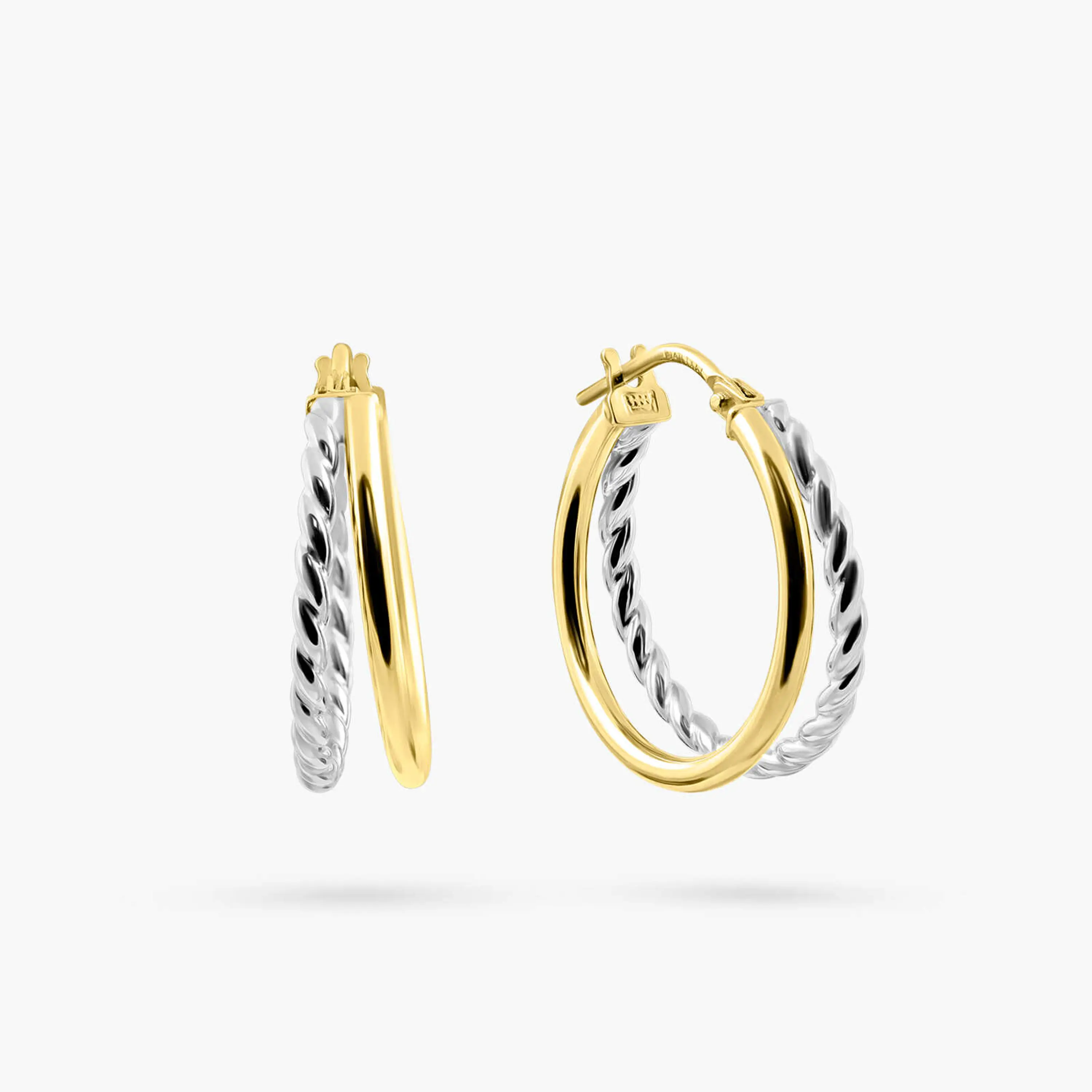 עגילי חישוק כפול עשויים זהב 14K דו-גוני זהב צהוב מבריק בשילוב טוויסט זהב לבן בטקסטורה סיבובית עדינה. העיצוב משלב בין קלאסיקה לנוכחות מודרנית, ויוצר מראה עשיר, אלגנטי ומלא תנועה. מתאימים לכל מי שאוהבת לשחק עם סטייל בלי לוותר על הזהות האישית. קוטר העגילים 1.8 ס"מ.