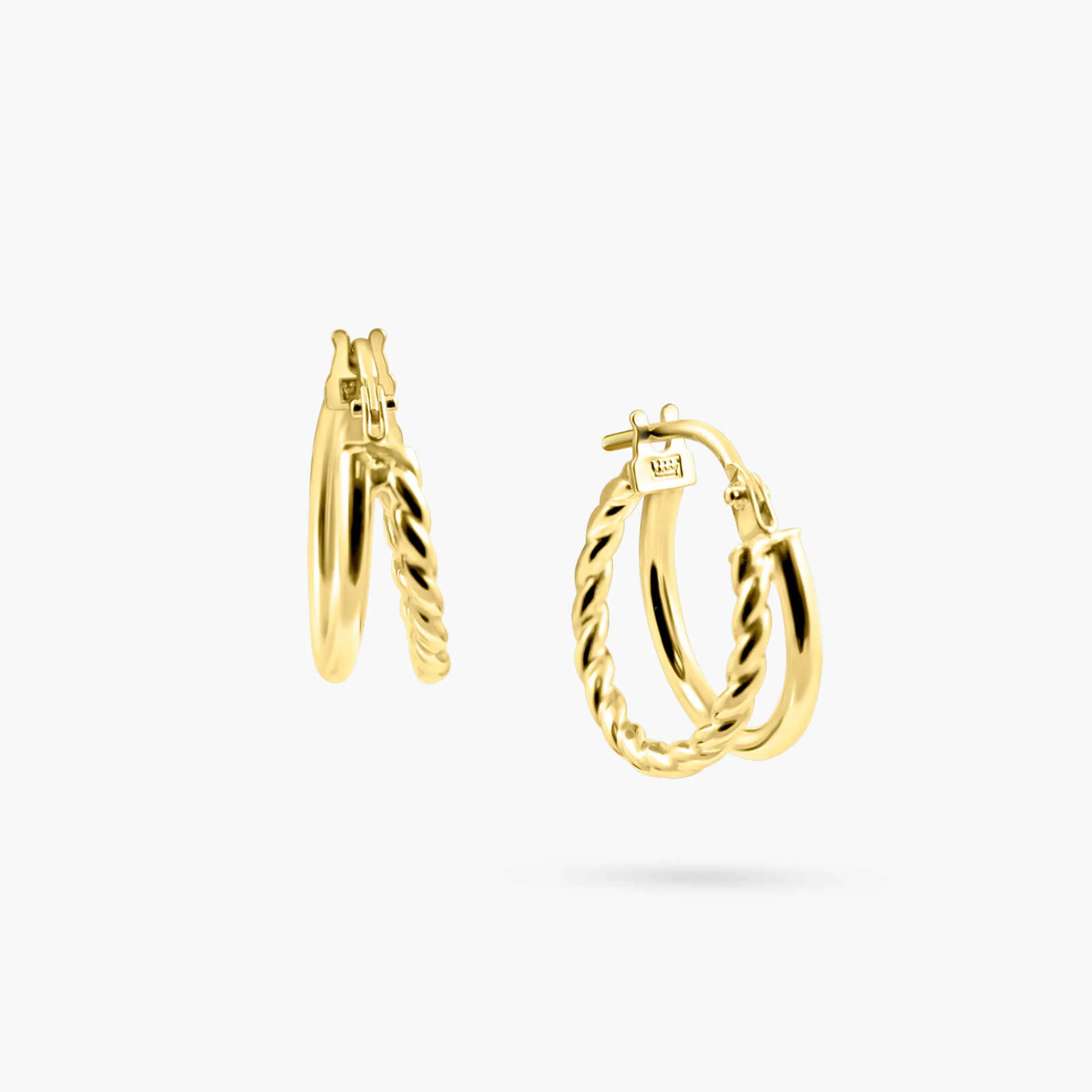 עגילי חישוק כפול מזהב צהוב 14K מביאים עיצוב אלגנטי ומודרני עם טוויסט תרתי משמע. זוג חישוקים כפול משלב בין קו חלק ונקי לחישוק עם טקסטורת בורג עדינה, ליצירת מראה מעניין, מחמיא ומלא תנועה. מתאימים לכל לוק בוקר, ערב או סתם רגע לעצמך. תכשיט שאת שמה עליו ולא מורידה. לנשים שלא צריכות לבחור בין קלאסי לטרנדי כי הן פשוט גם וגם. קוטר העגילים 1.3 ס"מ.