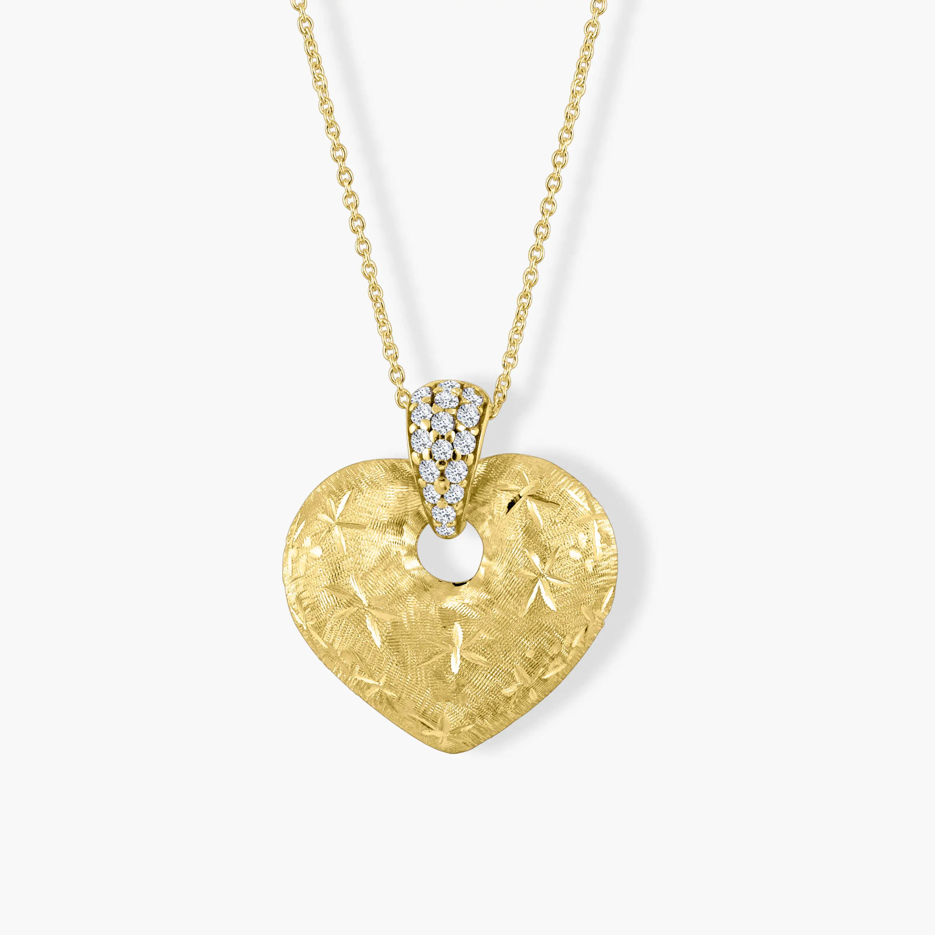 תליון לב עשוי זהב 14K בגימור מט ובמרקם חרוט בעבודת יד, המעוטר בזירקונים לבנים מנצנצים בלולאה. שילוב של טקסטורה ייחודית ונגיעה של ברק יוקרתי ליצירת תכשיט שמביע רגש, סגנון ונוכחות.