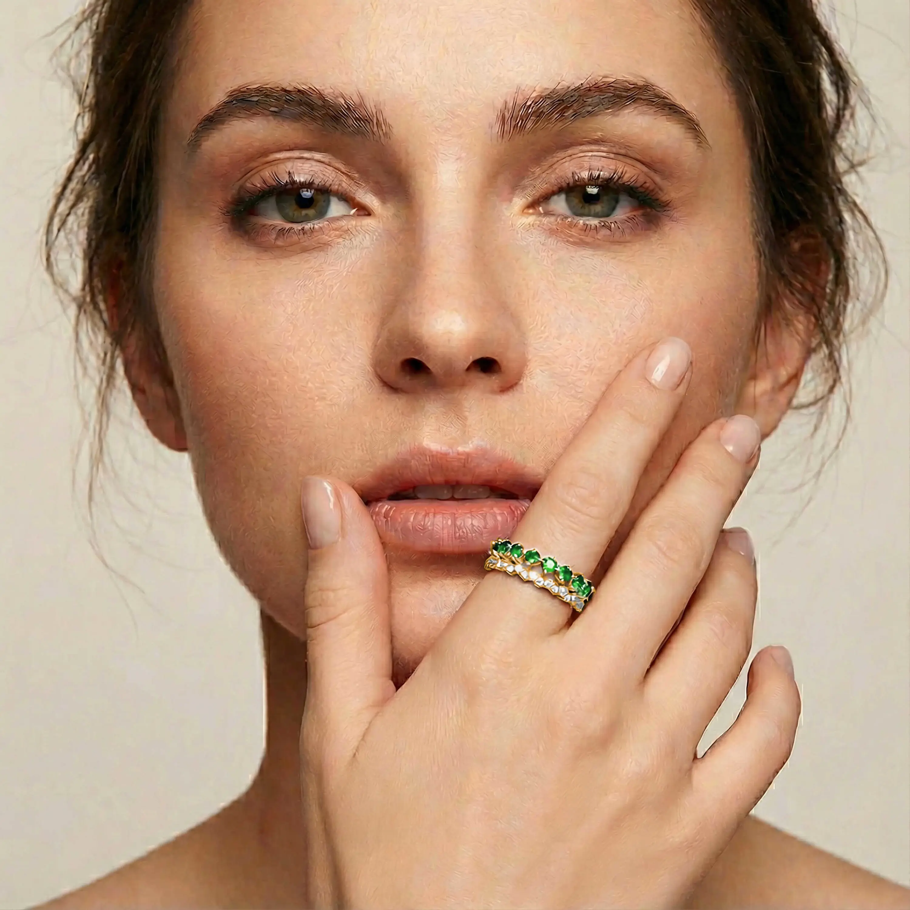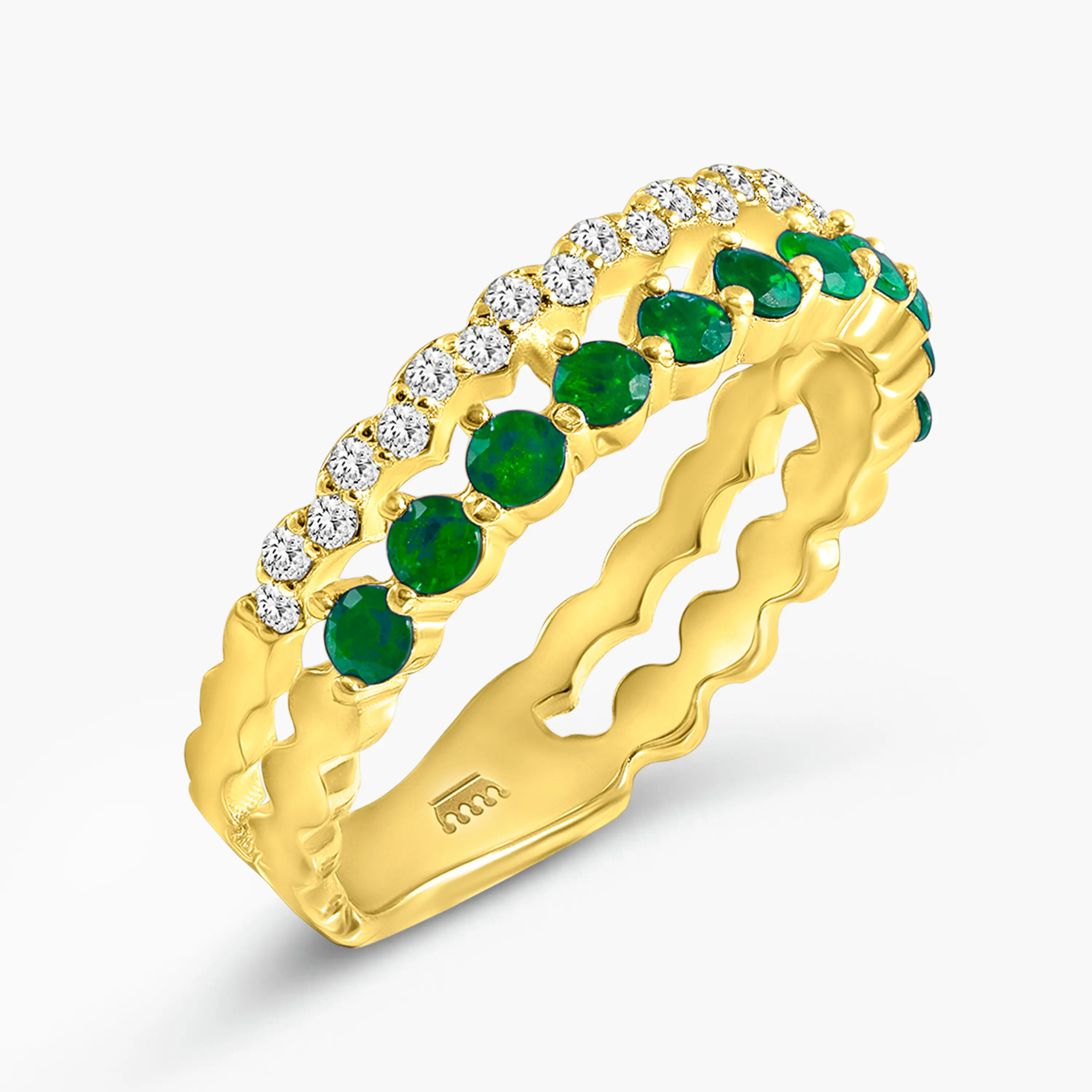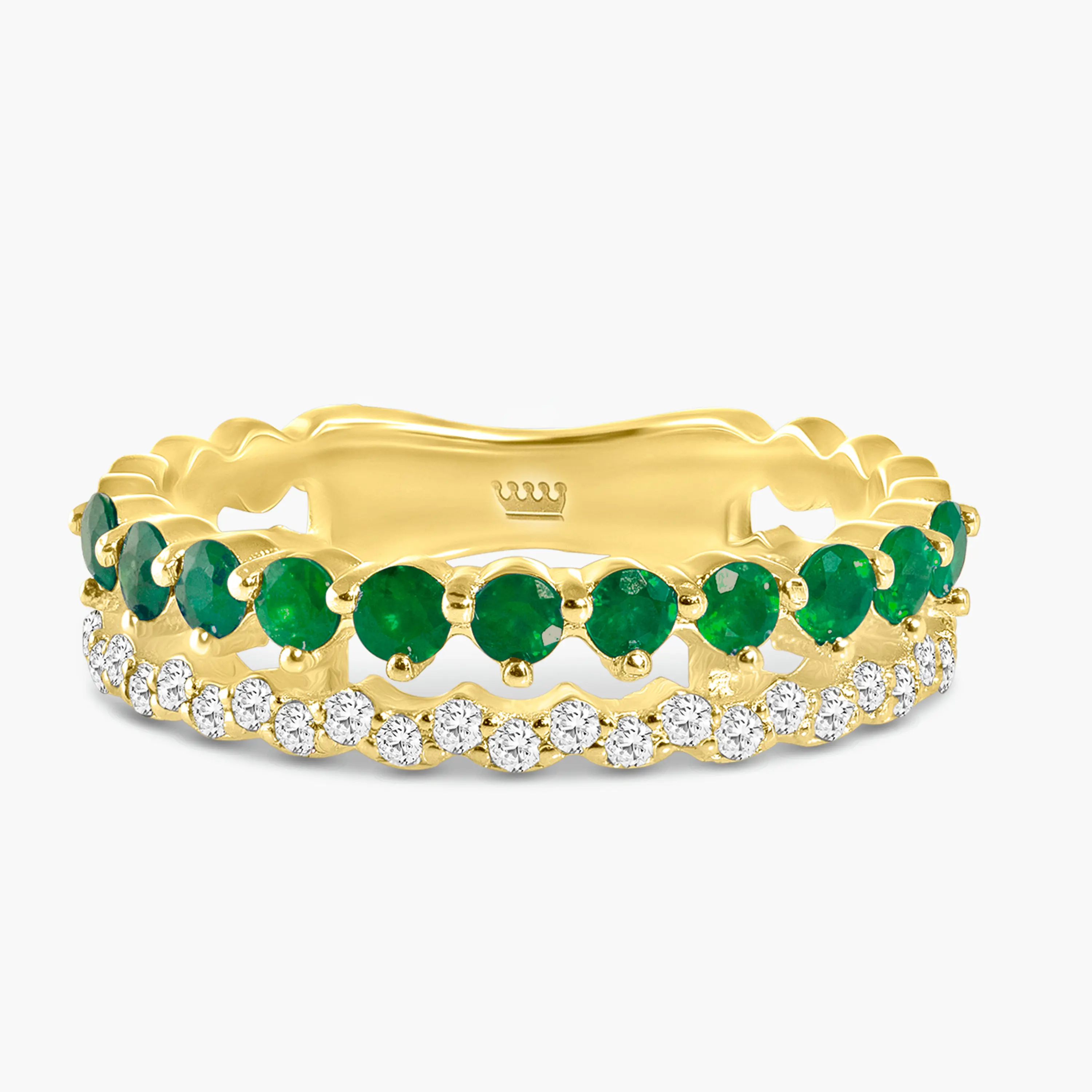 טבעת זהב 14K בעיצוב כפול ומעודן, השוזרת שני מסלולים משובצים האחד ביהלומים לבנים נוצצים, והשני באבני אמרלד ירוקות בגוון עשיר ועמוק. מבנה הטבעת הגלילי הפנימי מעניק לה מראה רך וזורם, בעוד השילוב בין הצבעים יוצר תחושת יוקרה מתוחכמת. שילוב נדיר של צבע, ברק ונוכחות, המציע מראה נשי וייחודי לכל סגנון.
