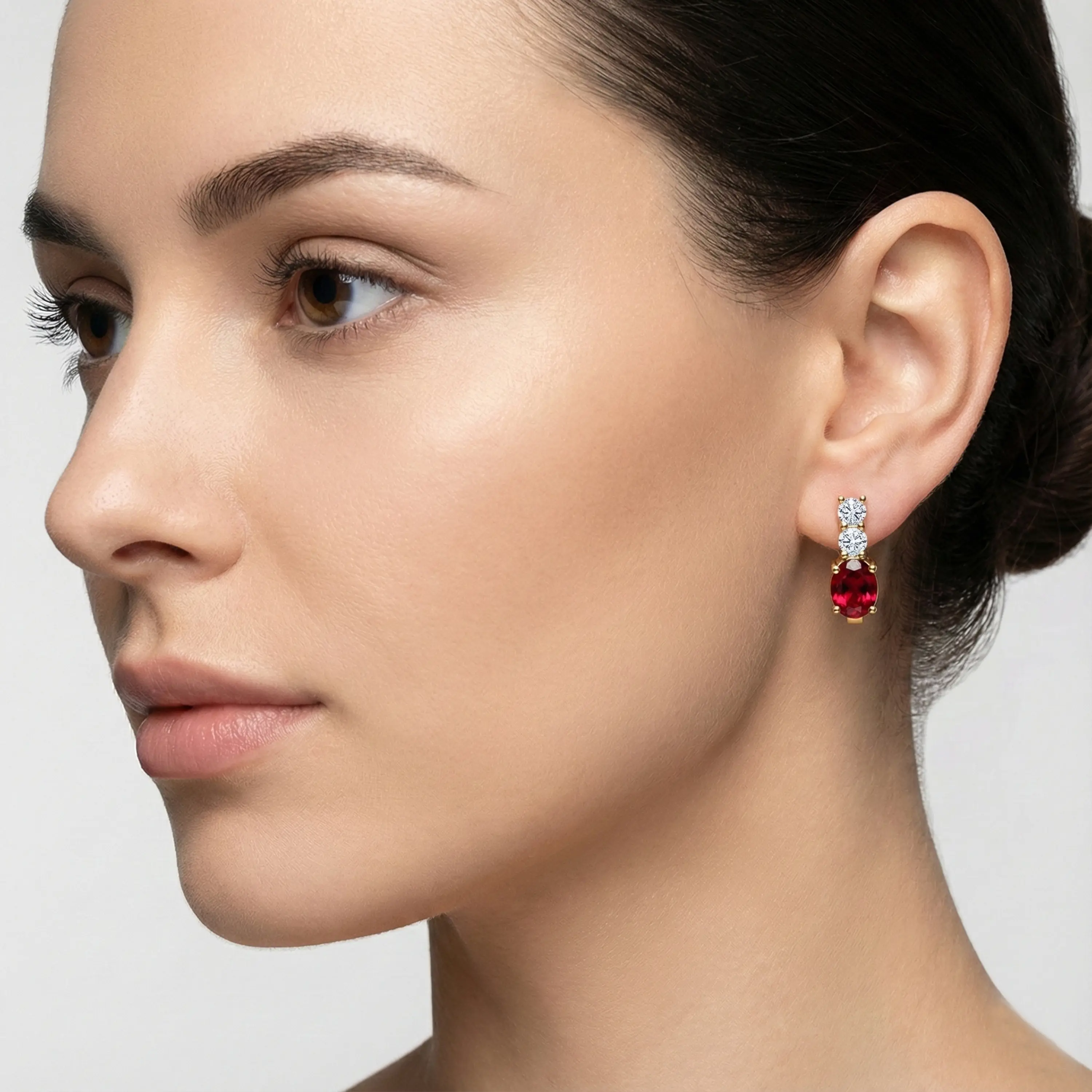 עגילים עשויים זהב 14K בעיצוב אלגנטי ומדויק, המשלב אבן חן מסוג רובי במראה עמוק ונוכח יחד עם יהלומי מעבדה המוסיפים ברק נקי ומאוזן. הקומפוזיציה האנכית יוצרת מראה מחמיא לאוזן עם נוכחות יוקרתית אך לא כבדה, כזה שמתאים גם לשעות היום וגם לערב. שילוב האבנים מעניק עומק צבע ותחושת יוקרה מודרנית, בעיצוב על זמני שמדבר בשקט ובדיוק, בהתאם לקו העיצוב של רויאלטי.