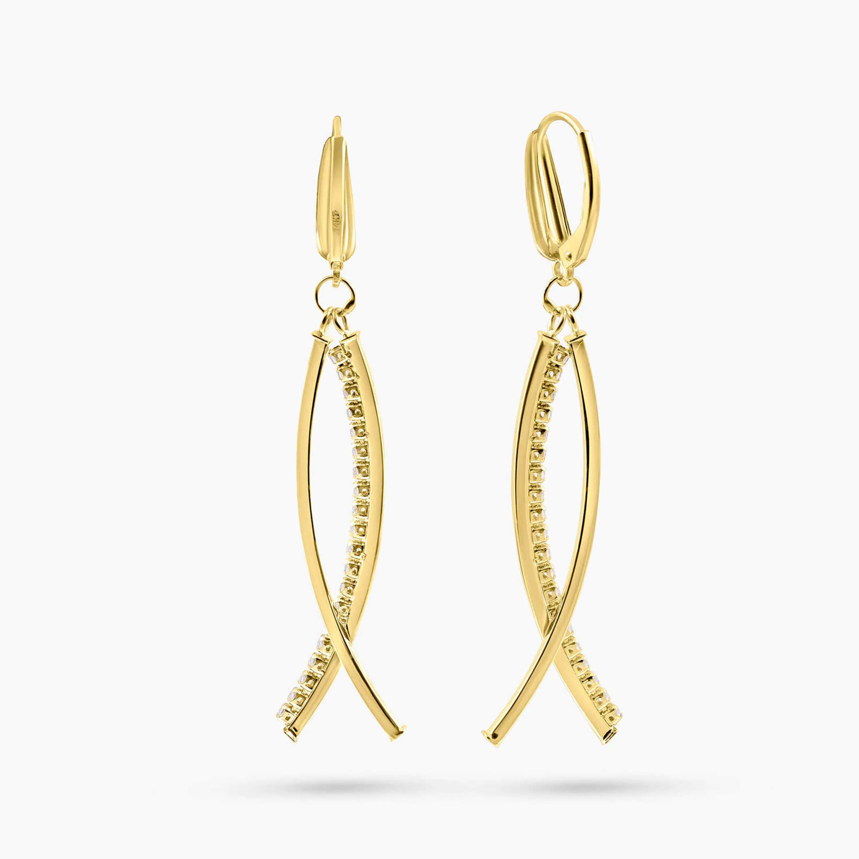 עגילים עשויים זהב 14K בעיצוב תלוי ואלגנטי, עם קווים זורמים ומראה עדין אך נוכח. בחלק הקדמי משובצים זרקונים המוסיפים נצנוץ רך ותנועה של אור בכל תזוזה. העיצוב אינו חישוק קלאסי אלא מבנה פתוח ותלוי, שמעניק מראה מודרני וקליל, מתאים לערב וגם לשדרוג הופעה יומיומית.