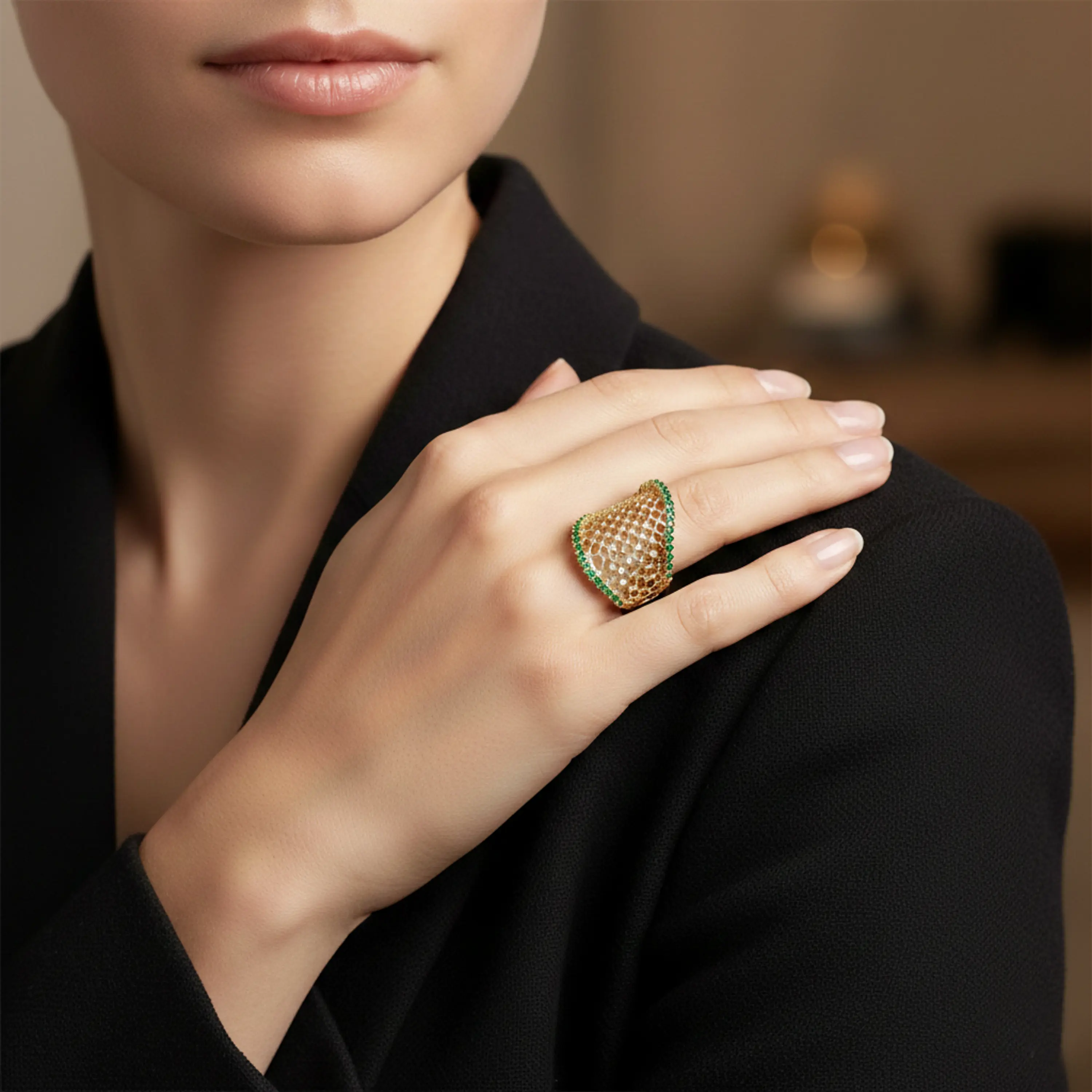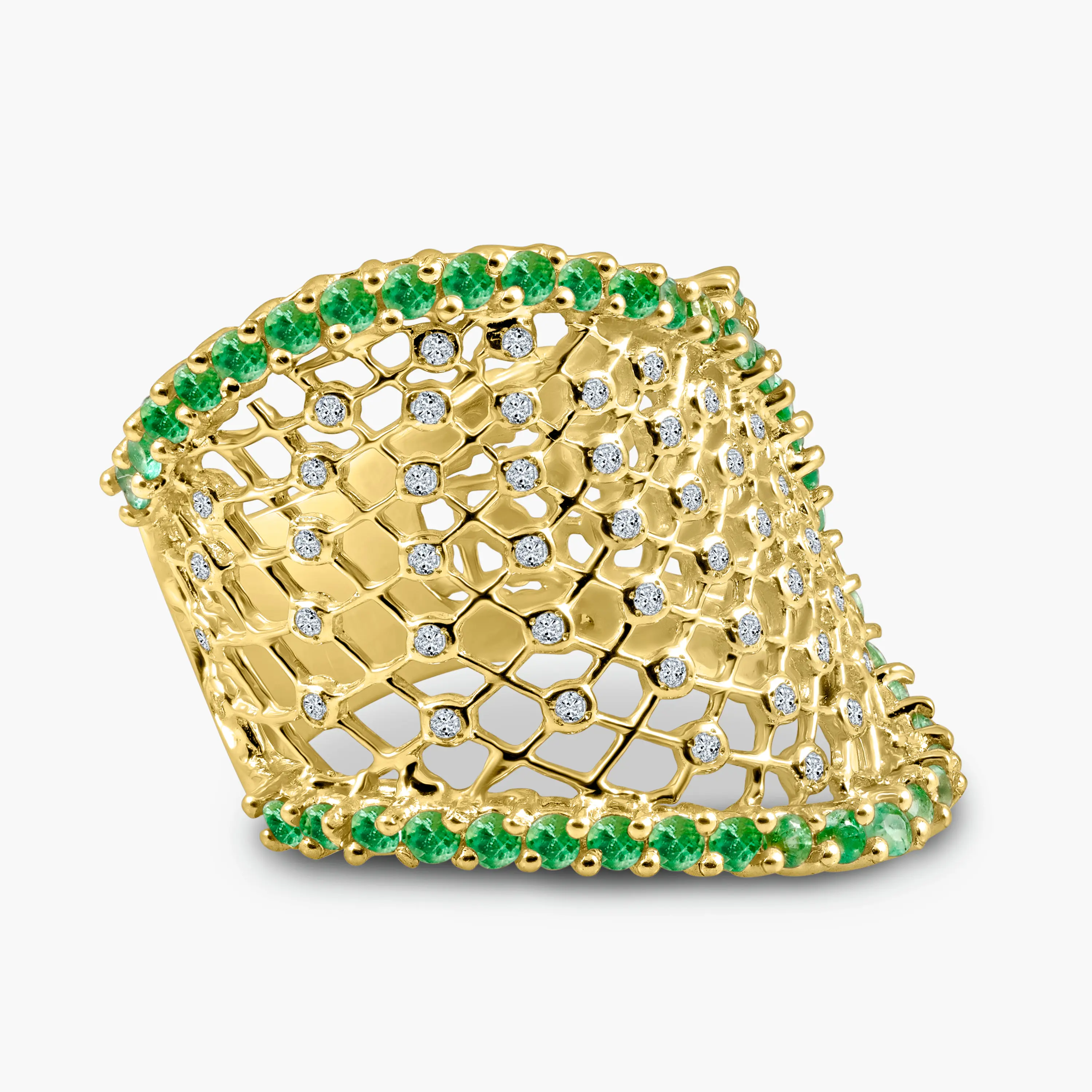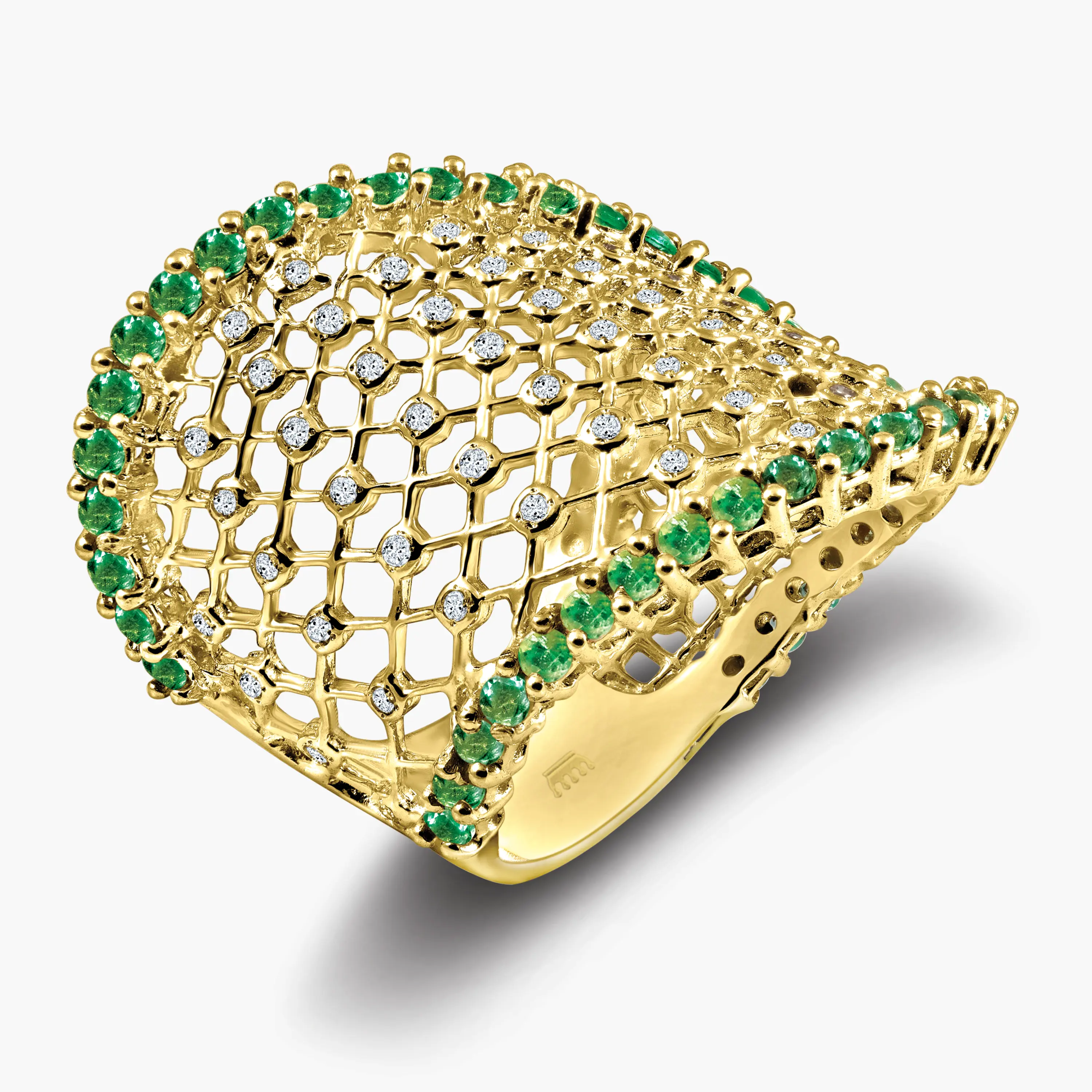 טבעת עשויה זהב 14K בעיצוב רחב ומרשים עם מבנה רשת פתוח. הטבעת משובצת יהלומים לאורך הדוגמה ובמסגרת משובצים אבני אמרלד ירוקות היוצרות ניגוד צבעים עשיר ועמוק. שילוב של נוכחות עוצמתית עם עבודת צורפות מדויקת, טבעת שמושכת תשומת לב בלי להתאמץ.