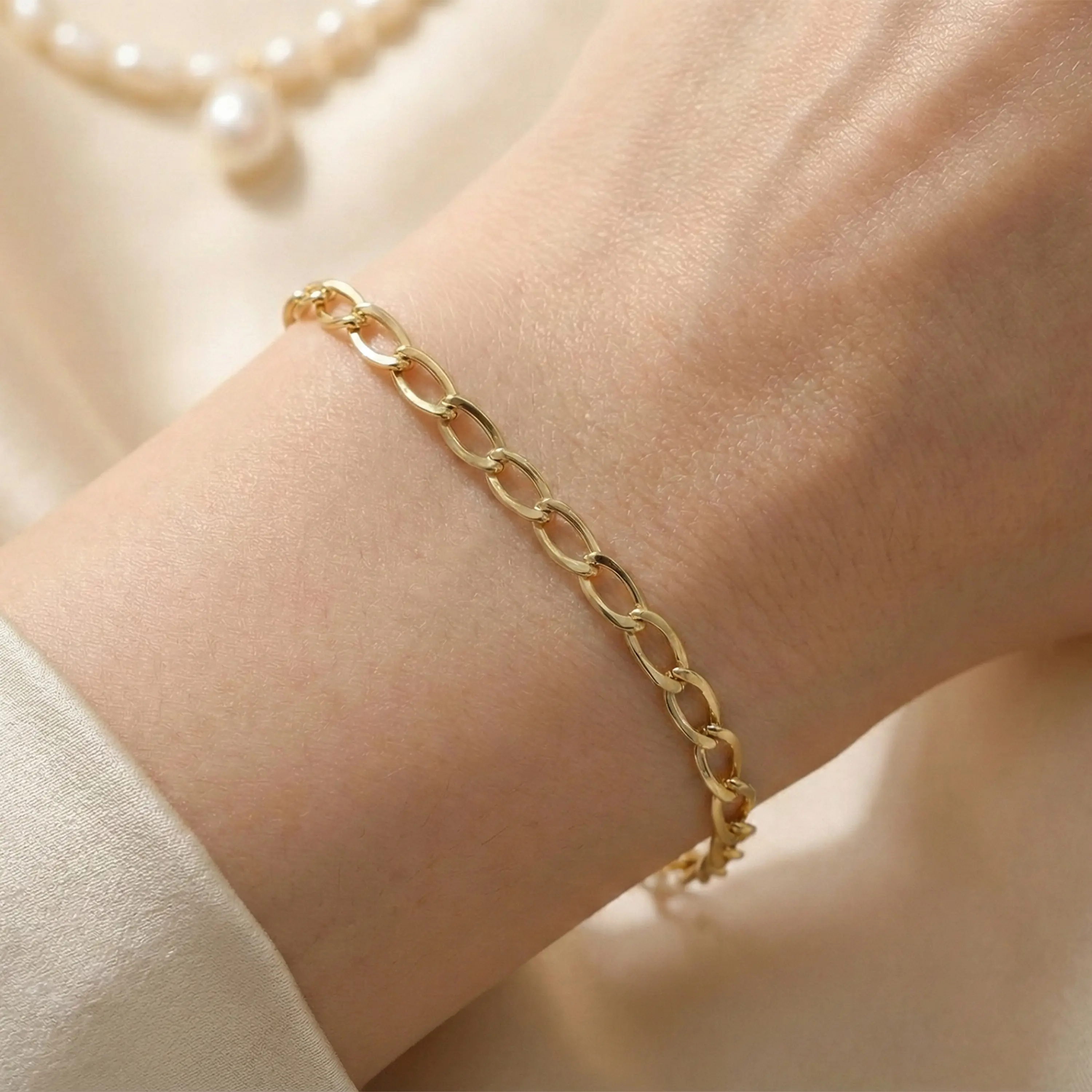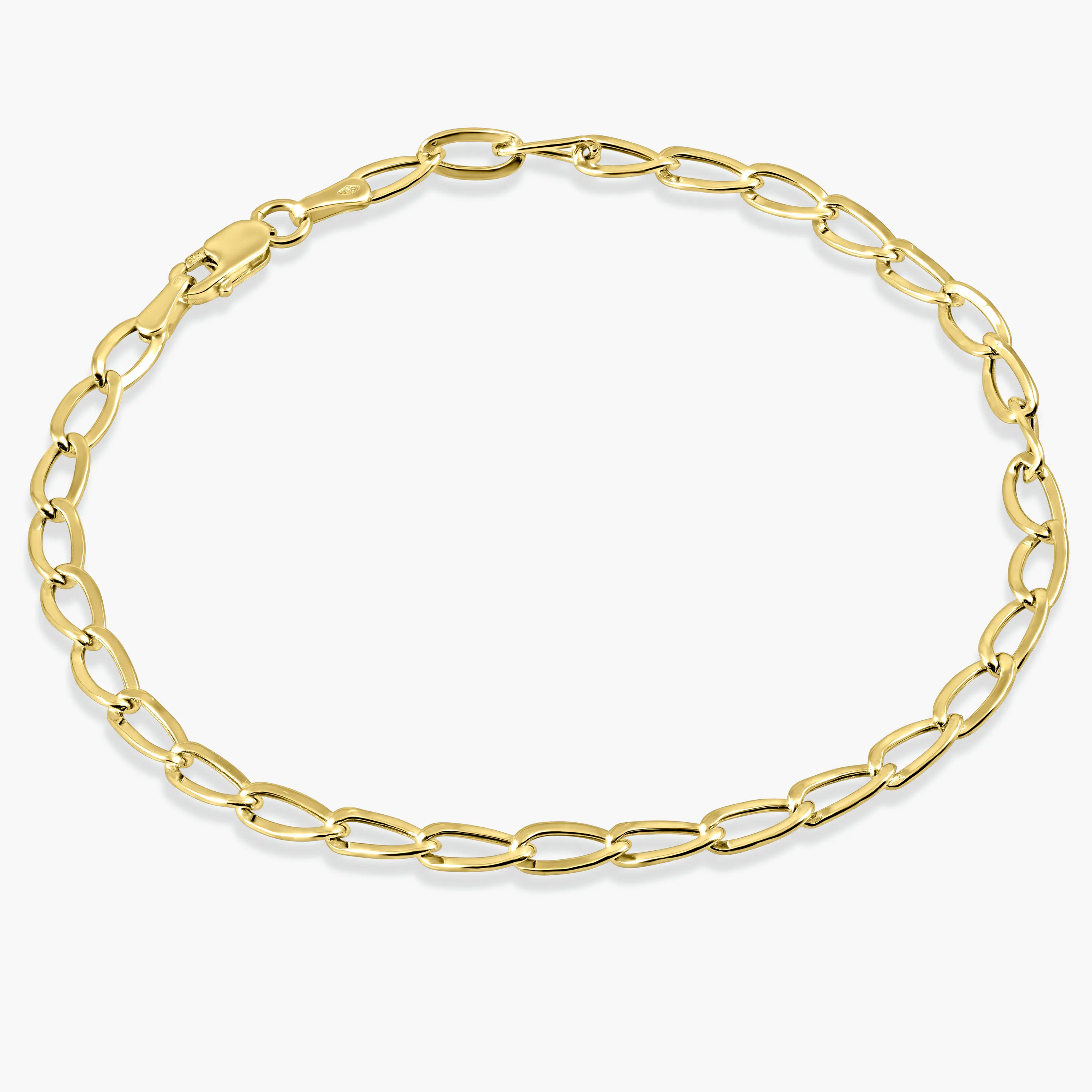 צמיד עשוי זהב 14K בעיצוב חוליות אובליות קלאסיות במראה נקי ועל זמני. מבנה החוליות יוצר נוכחות עדינה אך מורגשת על פרק היד ומתאים לשילוב עם צמידים נוספים או לענידה בפני עצמו. אורך הצמיד 20 סנטימטר. סגירת לובסטר בטוחה ונוחה לשימוש יומיומי.