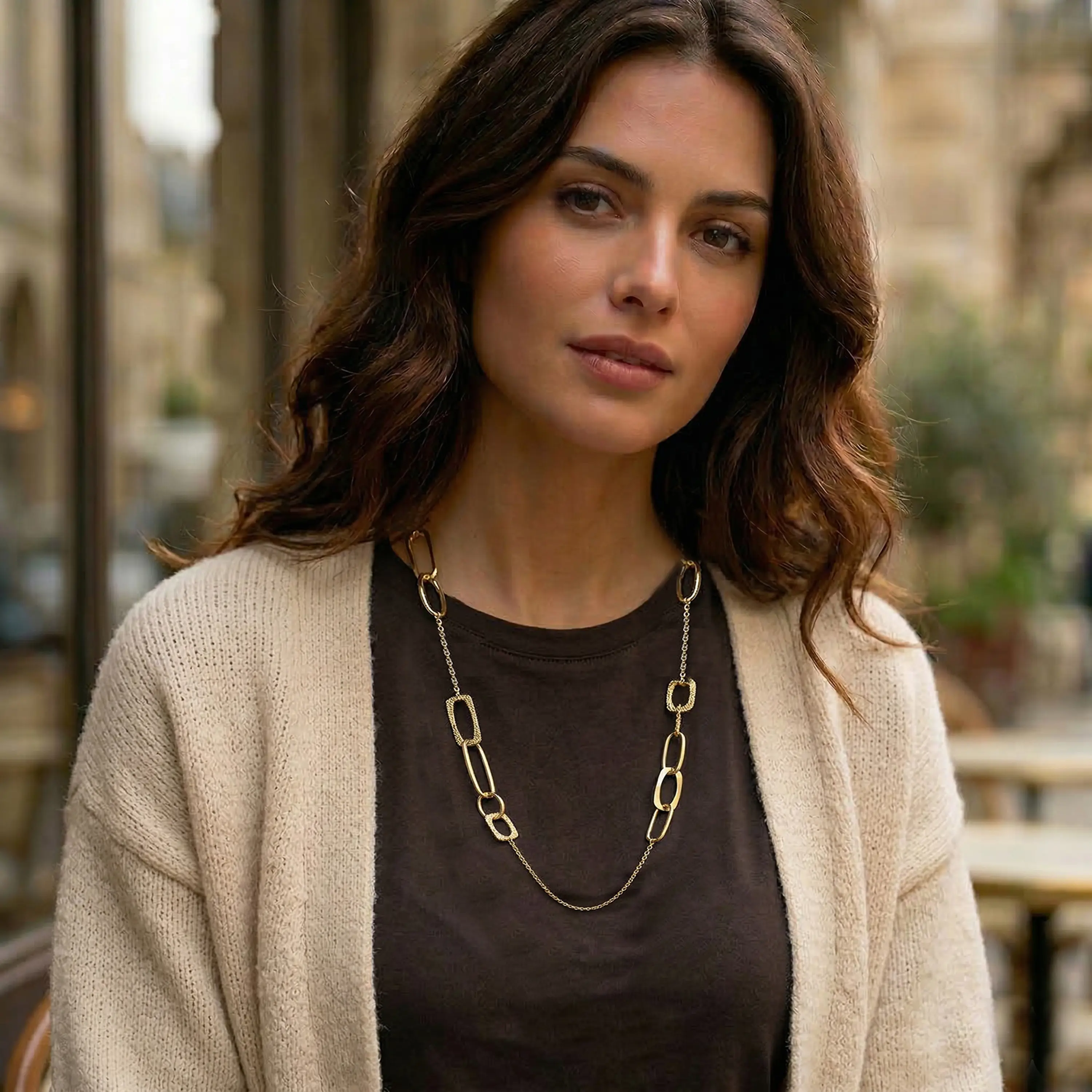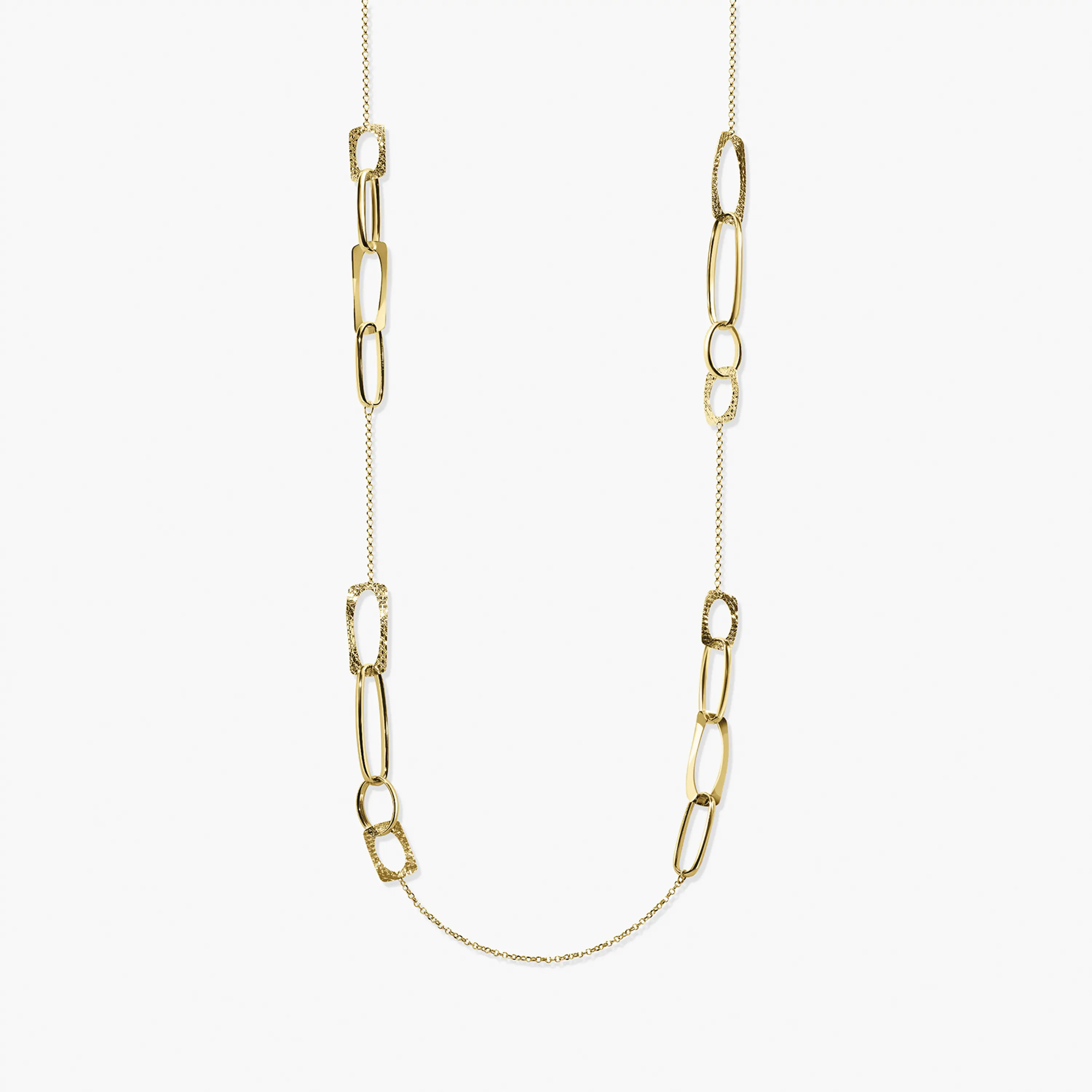שרשרת זהב 14K באורך 80 ס"מ בעיצוב מודרני המשלב ארבעה סוגי חוליות בגדלים שונים ליצירת מראה דינמי ועשיר. החוליות משתלבות בקצב עיצובי משתנה הכולל מידות 2.5 על 1.3 ס"מ, 3 על 1 ס"מ, 1.5 על 1 ס"מ ו 1.8 על 1.2 ס"מ, היוצרות משחק פרופורציות מעניין ונוכחות ייחודית. השילוב בין חוליות חלקות לצד חוליות מעודנות מעניק עומק ותנועה לתכשיט ומאפשר לו להשתלב בקלות גם כמוקד מרכזי וגם בשילוב שכבות עם שרשראות נוספות למראה אופנתי ומוקפד.
