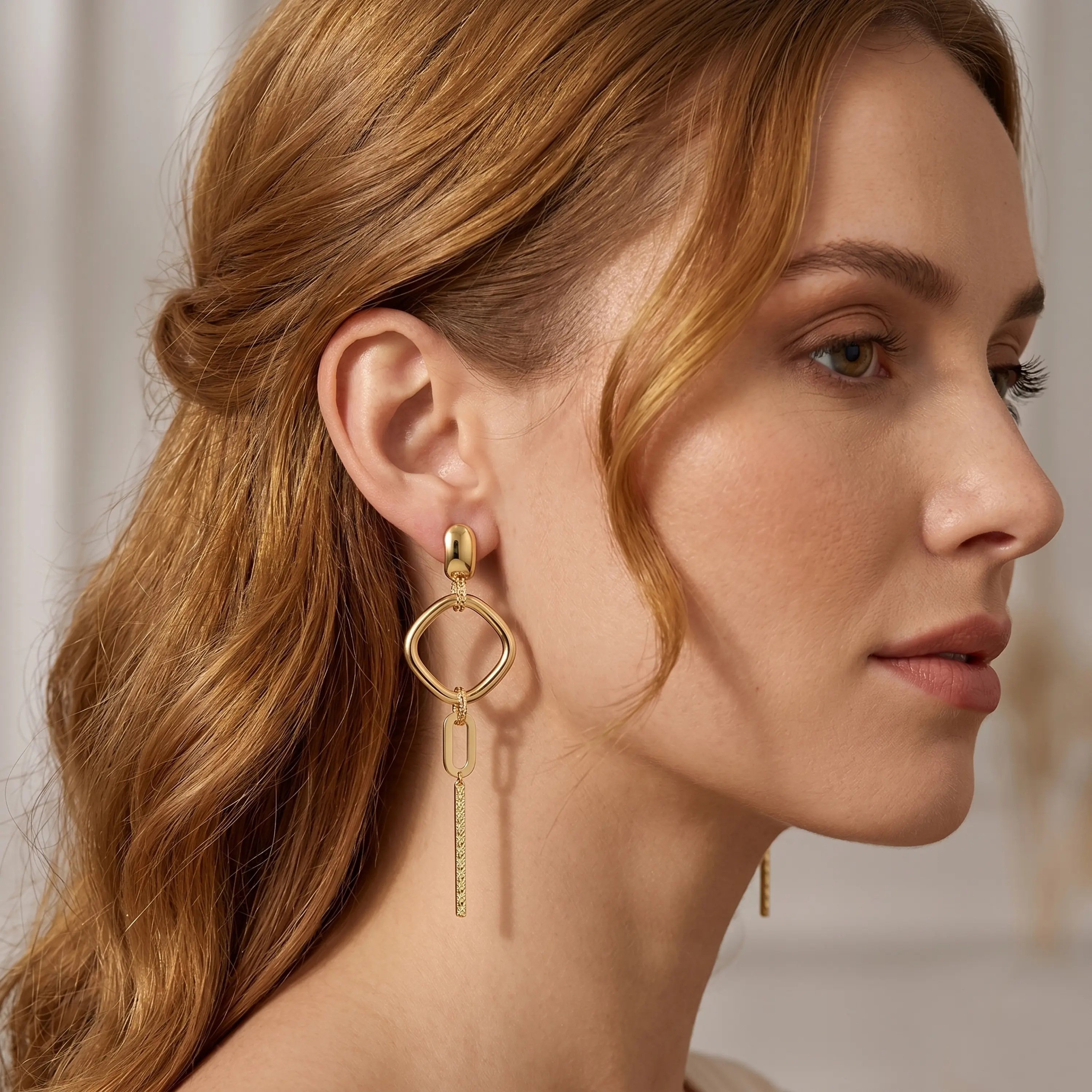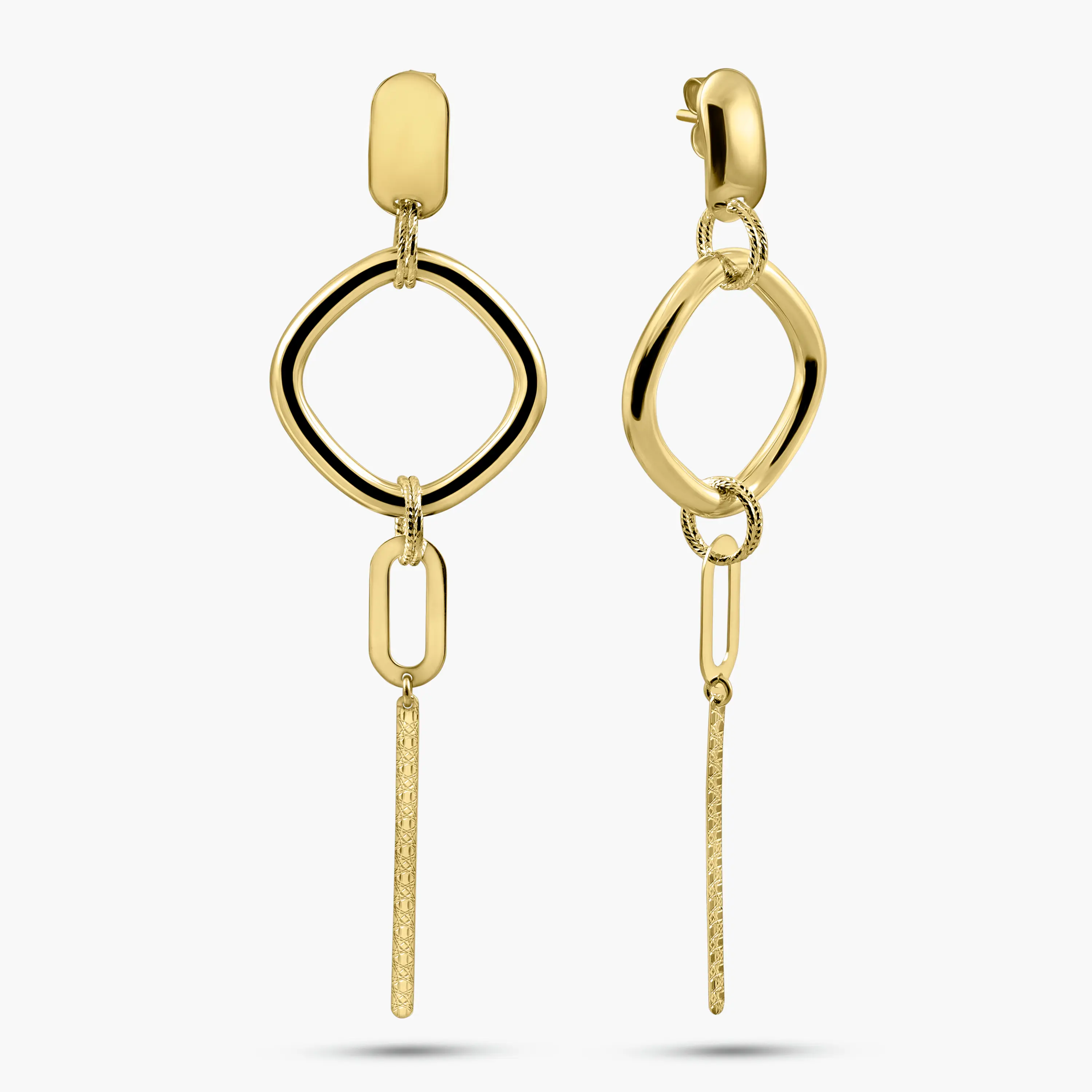 עגילי זהב 14K בעיצוב תלוי המשלב אלמנט מרובע מרכזי לצד חוליה תחתונה מוארכת ליצירת מראה מודרני ודינמי. אורך העגילים 8.5 ס"מ מעניק נוכחות מרשימה, כאשר האלמנט המרובע במידה של 2.5 ס"מ יוצר מוקד עיצובי ברור והחוליה הארוכה באורך 3 ס"מ מוסיפה קו זורם ואלגנטי. השילוב בין קווים גיאומטריים נקיים לבין תנועה עדינה יוצר תכשיט אופנתי ובולט המתאים לאירועים מיוחדים וגם להשלמת מראה יומיומי עם אמירה עיצובית.