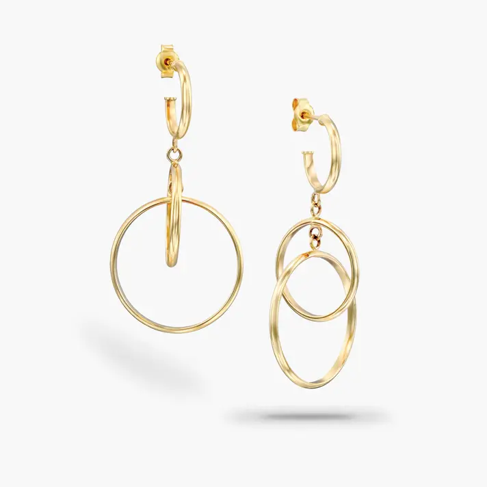 עגילי זהב 14K ג'יפסי כפולים המעוצבים כעגיל גדול המרחף בתוך עגיל קטן יותר. אורך העגילים 4.5 ס"מ. קוטר החישוקים 2.2 ס"מ ו1.6 ס"מ