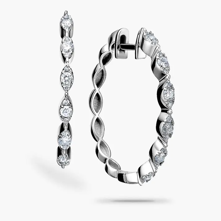 עגילי זהב 14K בצורת חישוק המשובצים 36 יהלומים טבעיים ונוצצים. קוטר העגילים הפנימי 2.1 ס"מ, קוטר העגילים החיצוני 2.5 ס"מ