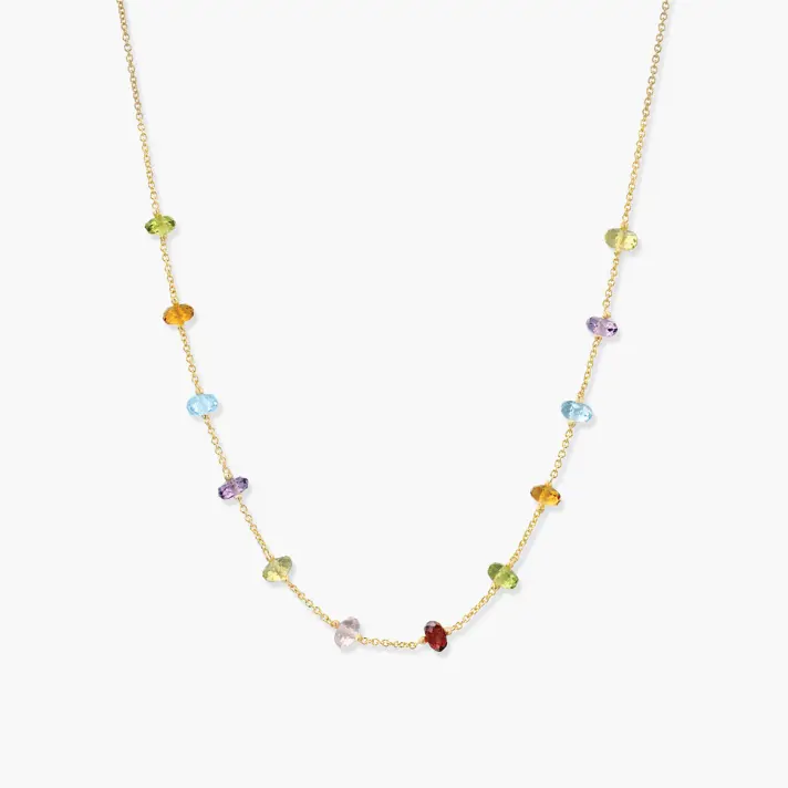שרשרת זהב 14K משובצת אבני חן בצבעים שונים. אורך השרשרת 43 ס"מ.