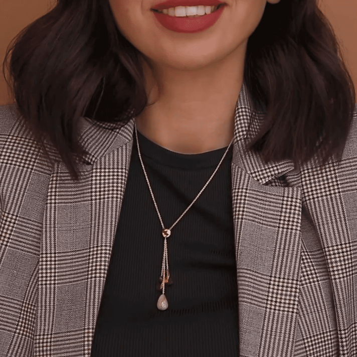 שרשרת זהב 14K עניבה הניתנת להגדלה והקטנה ובמרכזה תליון הבנוי מ 3 טיפות זהב, כאשר שתיים בזהב מבריק ואחת עשויה זהב ומצופה בקריסטלים נוצצים. אורך השרשרת 43 ס"מ, קוטר הטיפות 0.8*1.2 ס"מ .