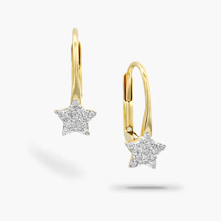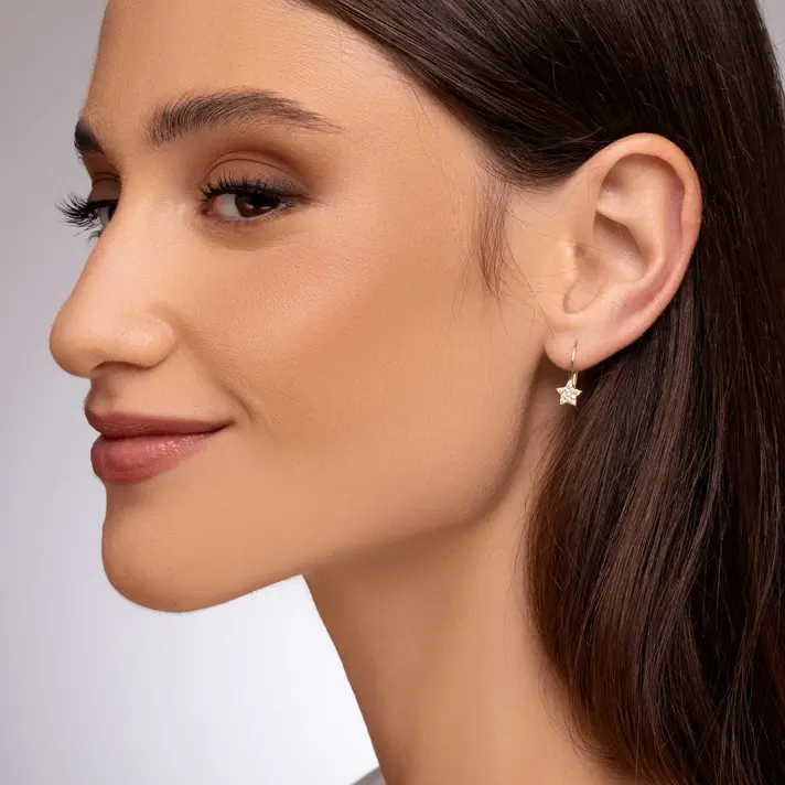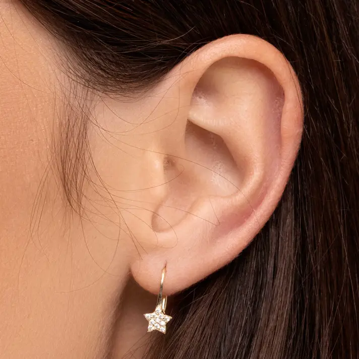 עגילי זהב 14K בצורת כוכבים משובצים בזירקונים נוצצים. אורך העגילים 1.5 ס"מ.