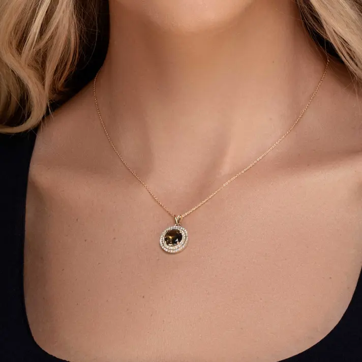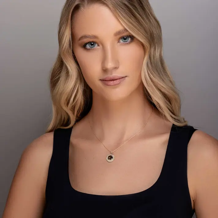 תליון זהב משובץ באבן סמוקי קוורץ מוקפת שני מעגלי יהלומים