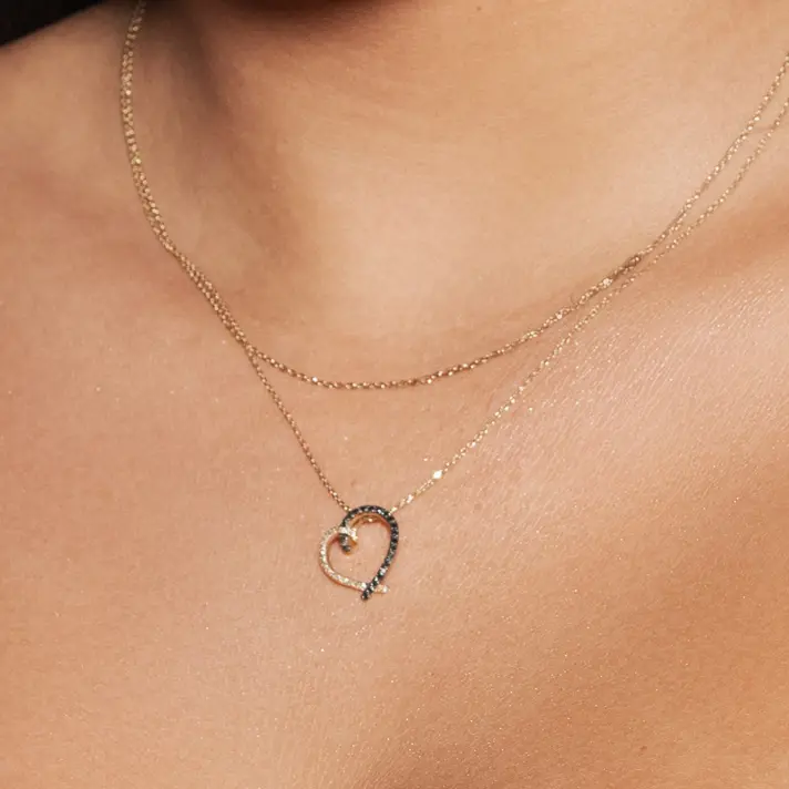 תליון לב זהב 14K צהוב משובץ ב-24 יהלומים שחורים וב-19 יהלומים לבנים, טבעיים ונוצצים. רוחב התליון 1.5 ס"מ וגובהו 1.8 ס"מ.