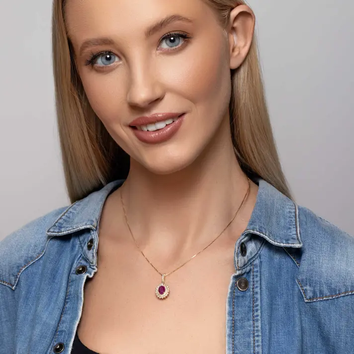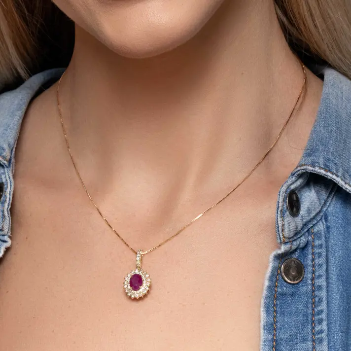 תליון זהב 14K משובץ באבן RUBY אדומה וטבעית וסביבה 41 יהלומים נוצצים. אורך התליון 1.5 ס"מ, רוחב התליון 0.8 ס"מ. אורך הרובי 0.7 ס"מ, רוחב הרובי 0.5 ס"מ