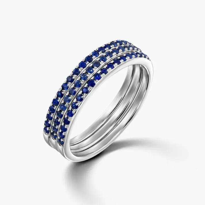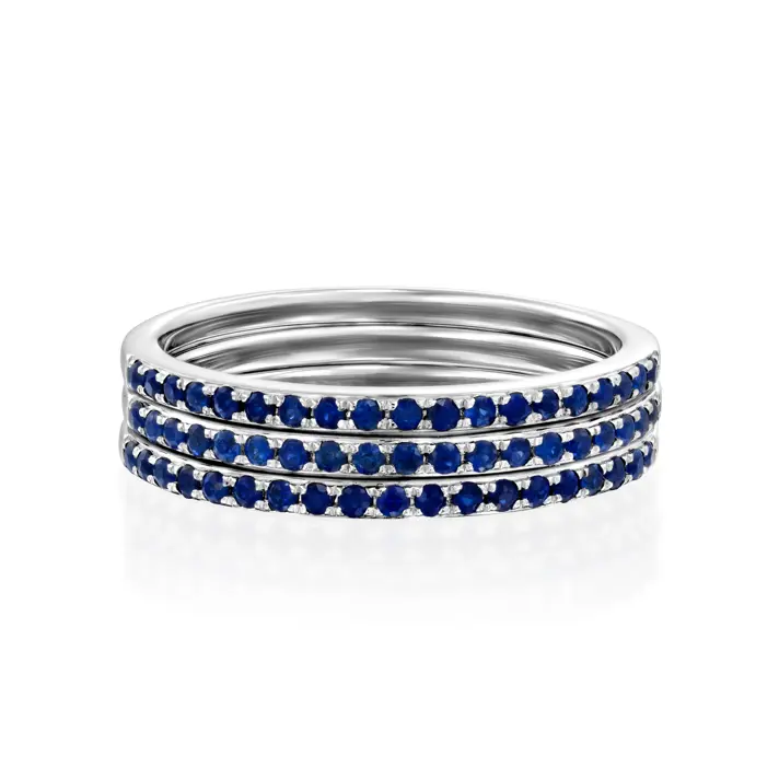 טבעת זהב 14K המורכבת מ 3 טבעות נפרדות משובצות בספירים כחולים בסגנון חצי נישואין. עובי הטבעת 4.5 מ"מ